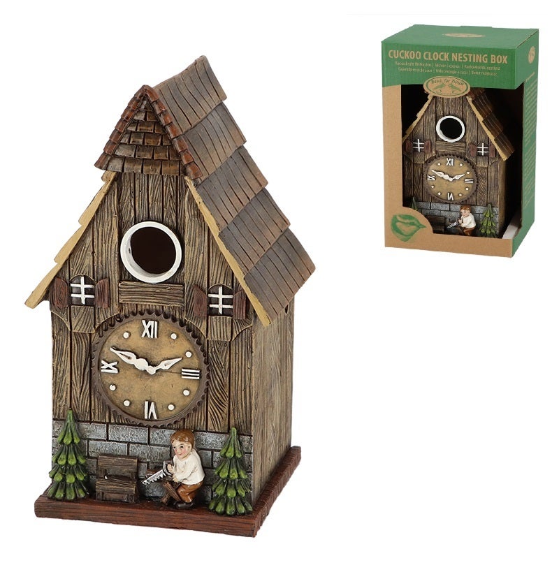 The cuckoo clock originated in the Black Forest in Germany. The invention of this clock is attributed to the Schönwald clockmaker Franz Ketterer. He is said to have made the clock in 1730. Initially, the clock was intended as an alarm clock, but the sound of the cuckoo could not be produced with a gong or bell. Organ builders in the Black Forest succeeded in reproducing the sound by means of rods attached to a bellows. Today Schonach in the Black Forest is the Mecca of the Cuckoo clock. This cuckoo clock nesting box is specially designed for the blue tit. It offers good nesting not only for the blue tit, but also the crested tit, marsh tit, willow tit and coal tit. During severe weather conditions, the nesting box offers shelter and protection. - ventilation holes beneath the roof - bottom can be lifted to clean the house (clean the nesting box only during autumn) - easy to hang thanks to the keyhole slot - suitable for the blue tit, crested tit, marsh tit, willow tit and coal tit