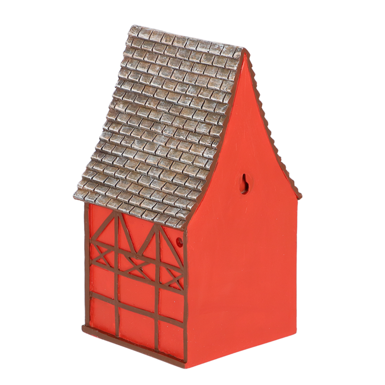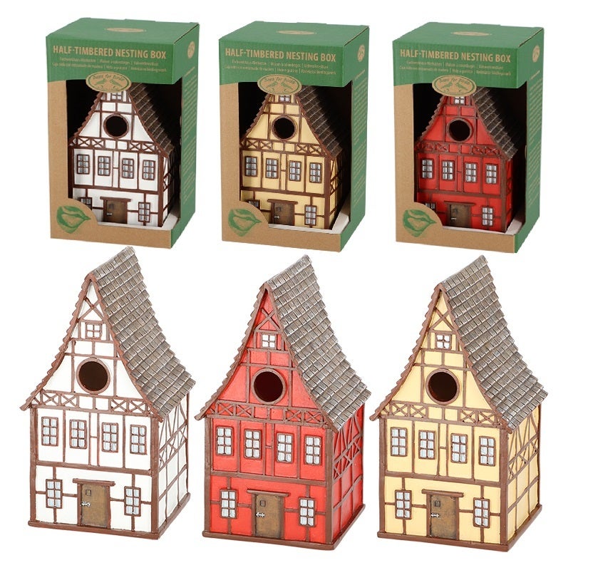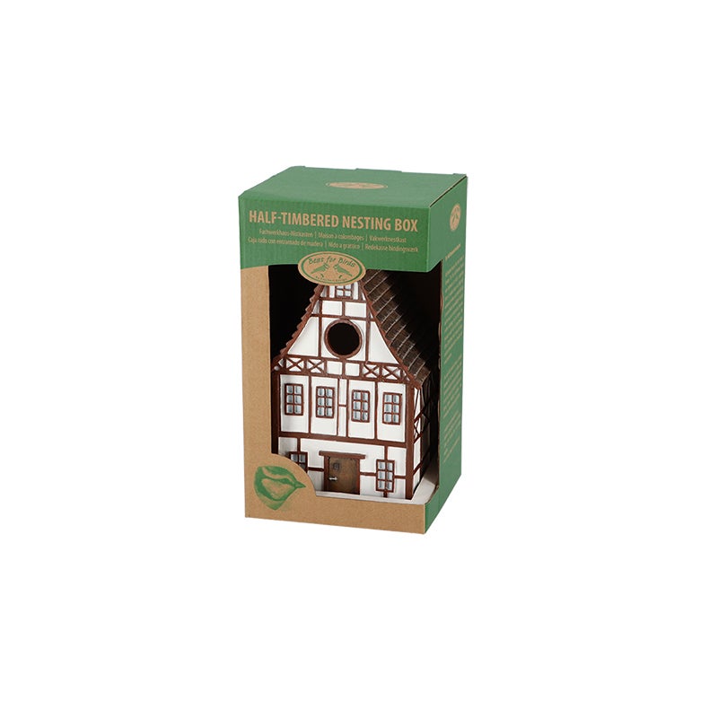 Half-timbered houses find their history in Germany. The first half-timbered houses were farmhouses in which a supporting frame of wooden beams was filled with wickerwork of willow, oak or hazel with clay or mortar. Besides the availability of material and the low cost of construction, there was another advantage for the farmers. The peasantry usually did not have hereditary rights, if the farmer had to move, the house could be demolished within a few days and rebuilt elsewhere.This small half-timbered house is specially designed for the blue tit. It offers good nesting not only for the blue tit, but also the crested tit, marsh tit, willow tit and coal tit. During severe weather conditions, the nesting box offers shelter and protection.