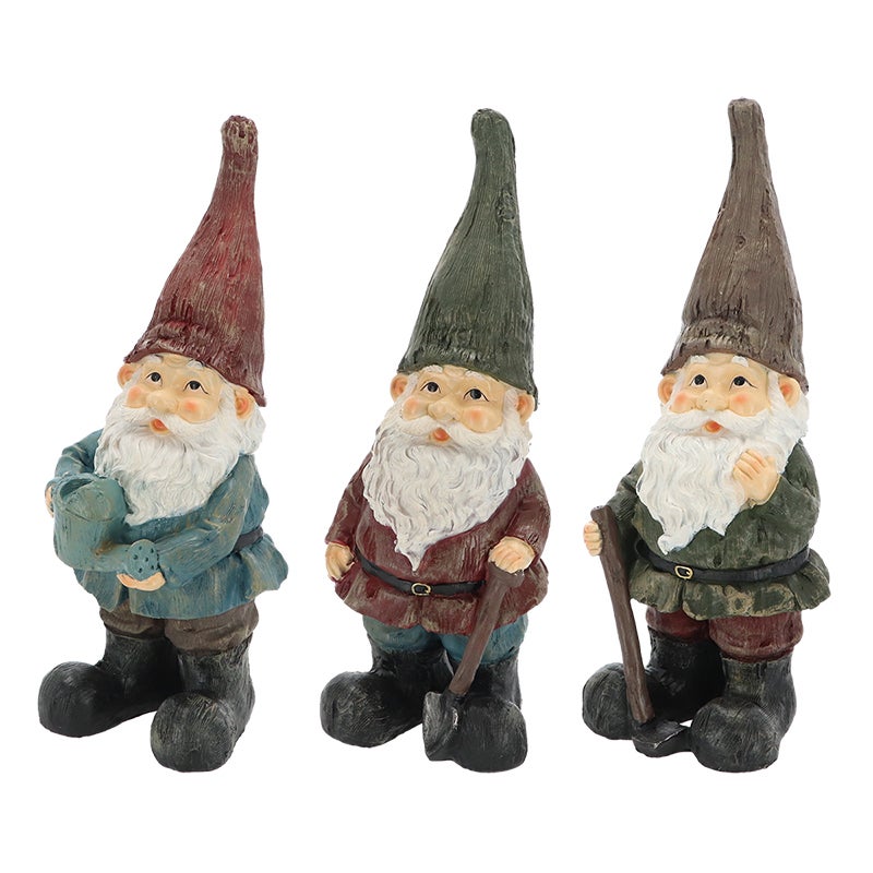 Decorate the garden with these funny garden gnomes made from polyresin. Suitable for in and outdoors, frost proof and UV proof.