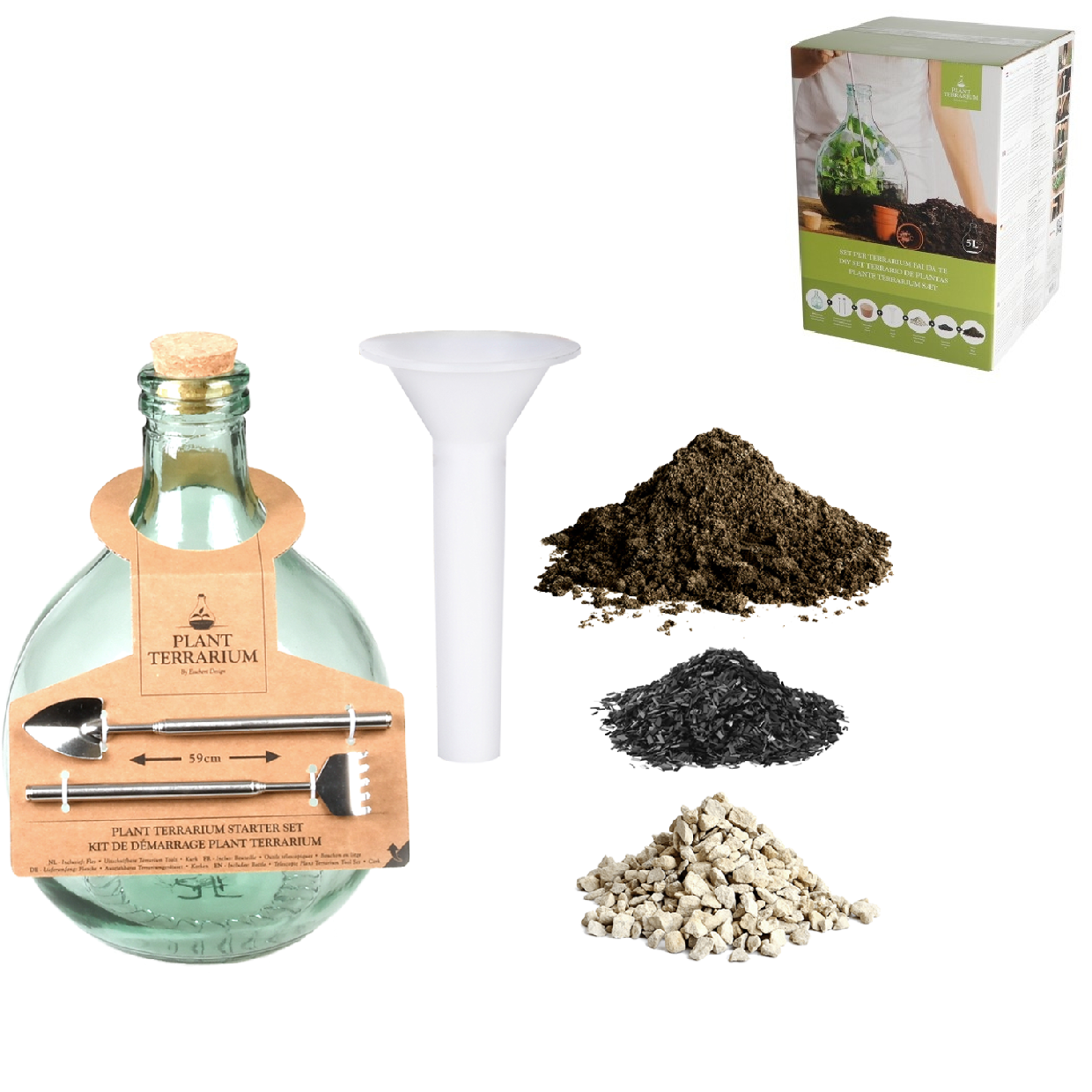 DIY Set Terrarium bottle 5 litre, Recycled glass, stones, soil, PE, stainless steel, cork, carbon, Romania