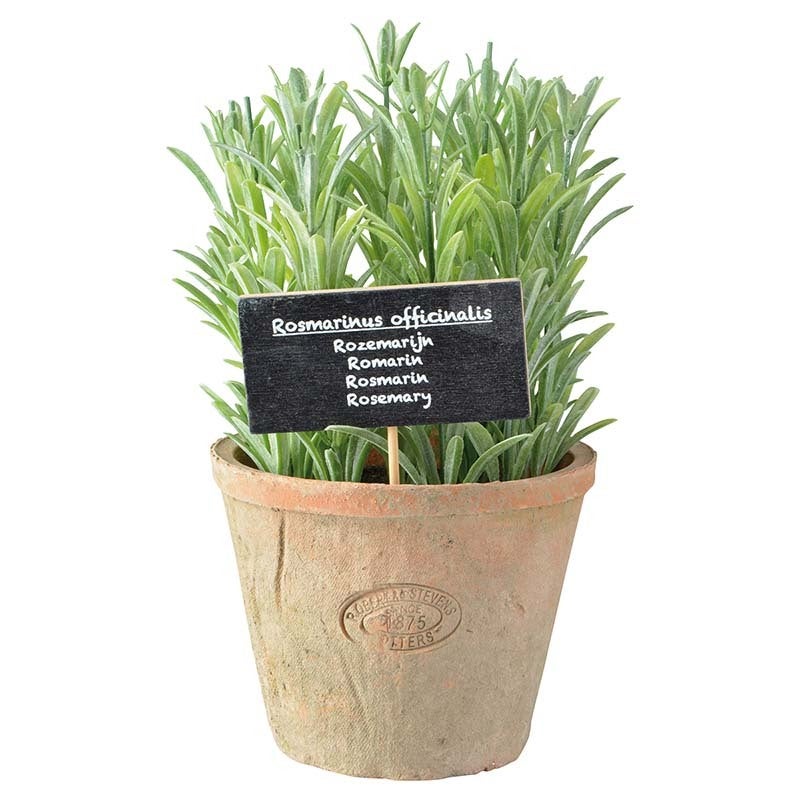 Decorative plastic Rosemary with wooden planter with the name of the herb (in Latin, Dutch, French, German and English). Terra cotta pot with a Robert Stevens & stamp.