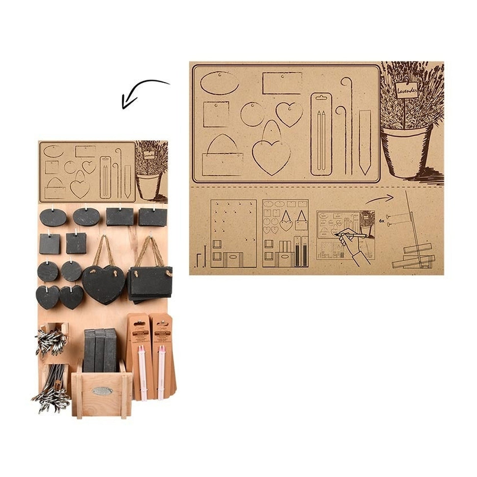 This display including header card holds all slate options. It provides a handy overview. The display is filled with large and small plant labels, plant markers, large and small pins for plant markers and pencils for writing on the slate.