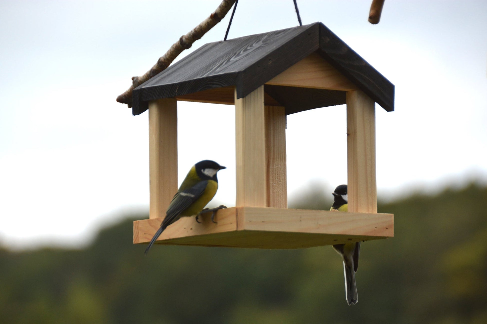 Spoil the birds in the garden with this sleek designed hanging bird table. The table has a black roof and is provided with a hanging cord.- easy to fill- sleek design- provided with hanging cord