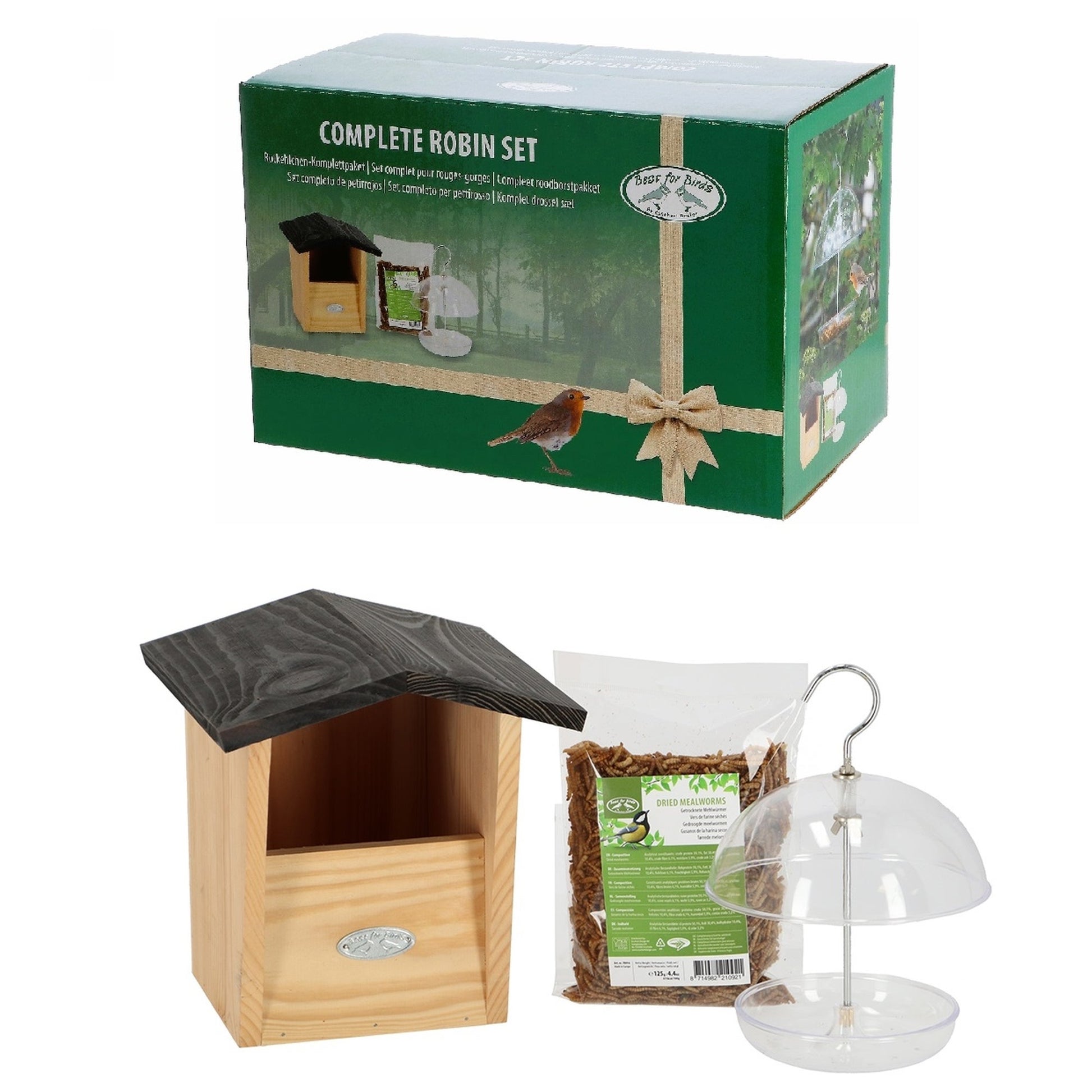 This kit contains everything needed to take care of the robins in the garden. The kit offers shelter and living space, dried mealworms 125g and a associated feeding system. Except the robin also the spotted flycatcher and the common redstart can be expected to visit the nesting box.- packed in a full colour gift box- complete set- including dried mealworms 125g and feeding system- including nesting box