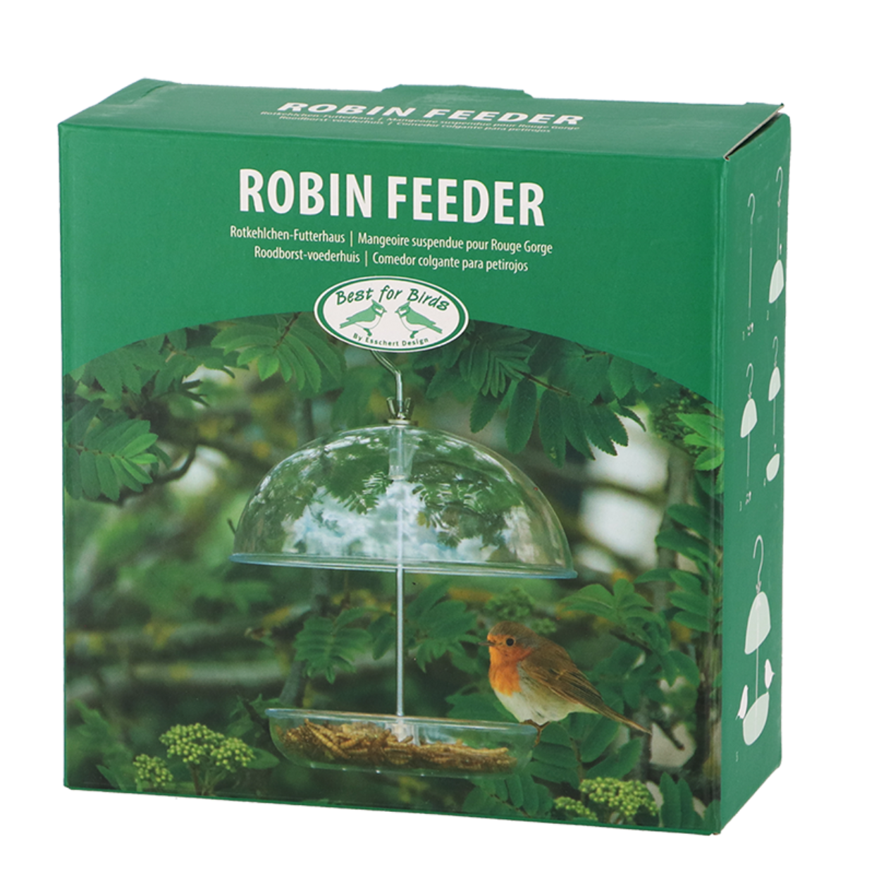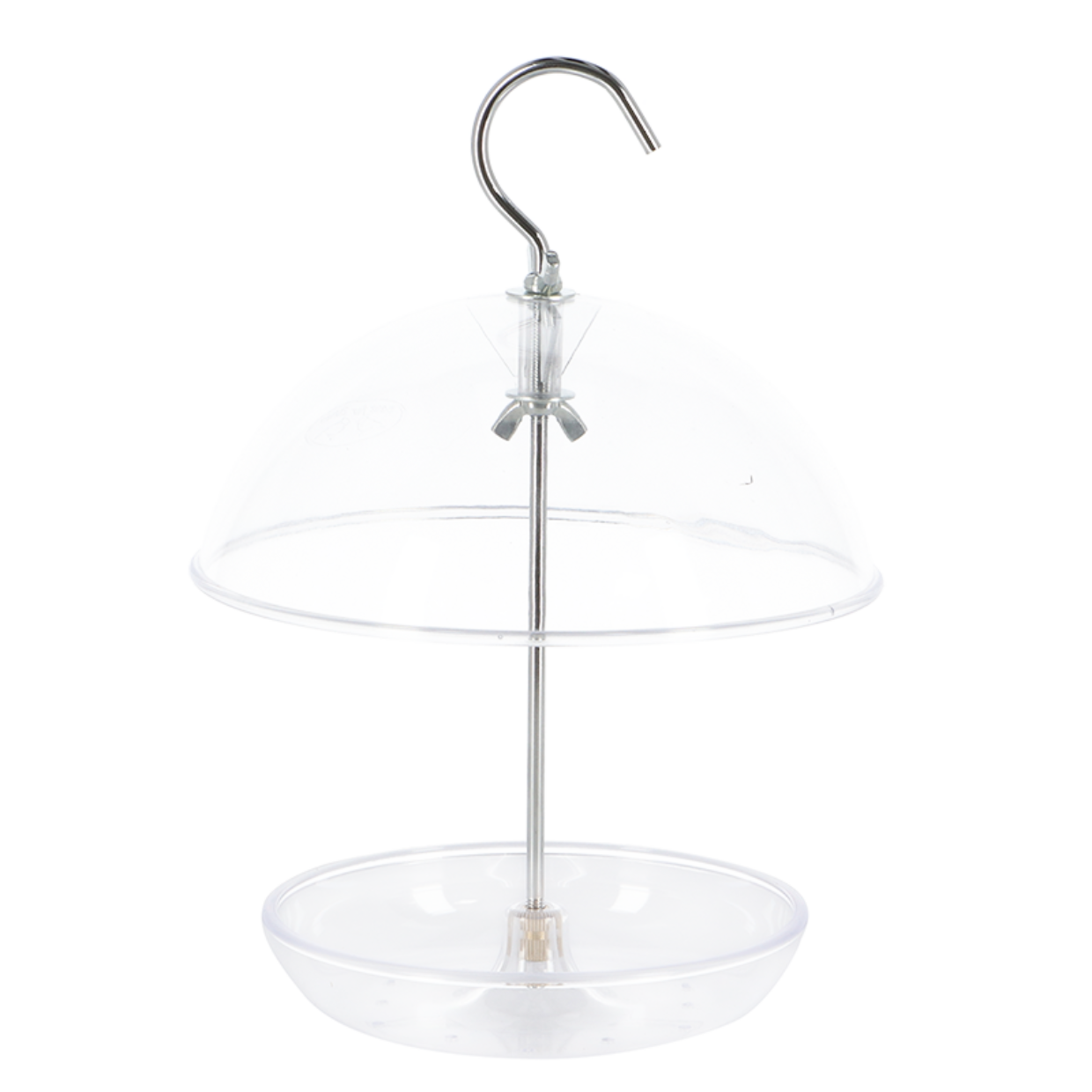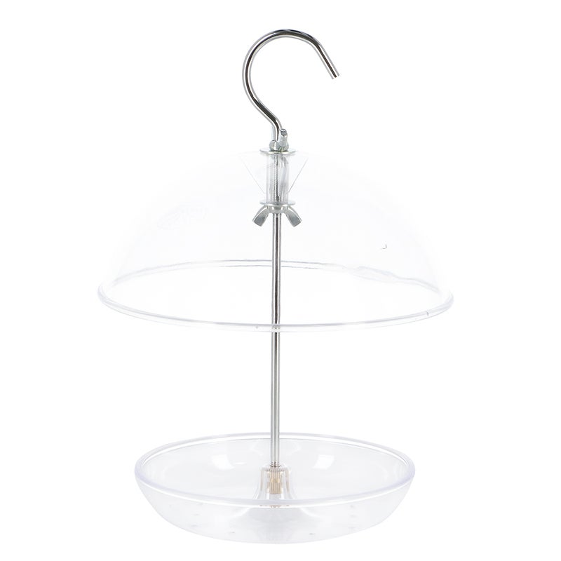 This robin feeder is provided with a domed roof which keeps the food dry. The birds can be clearly watched thanks to the transparent material.- with hanging hook- provided with a roof to keep the food dry- transparent material