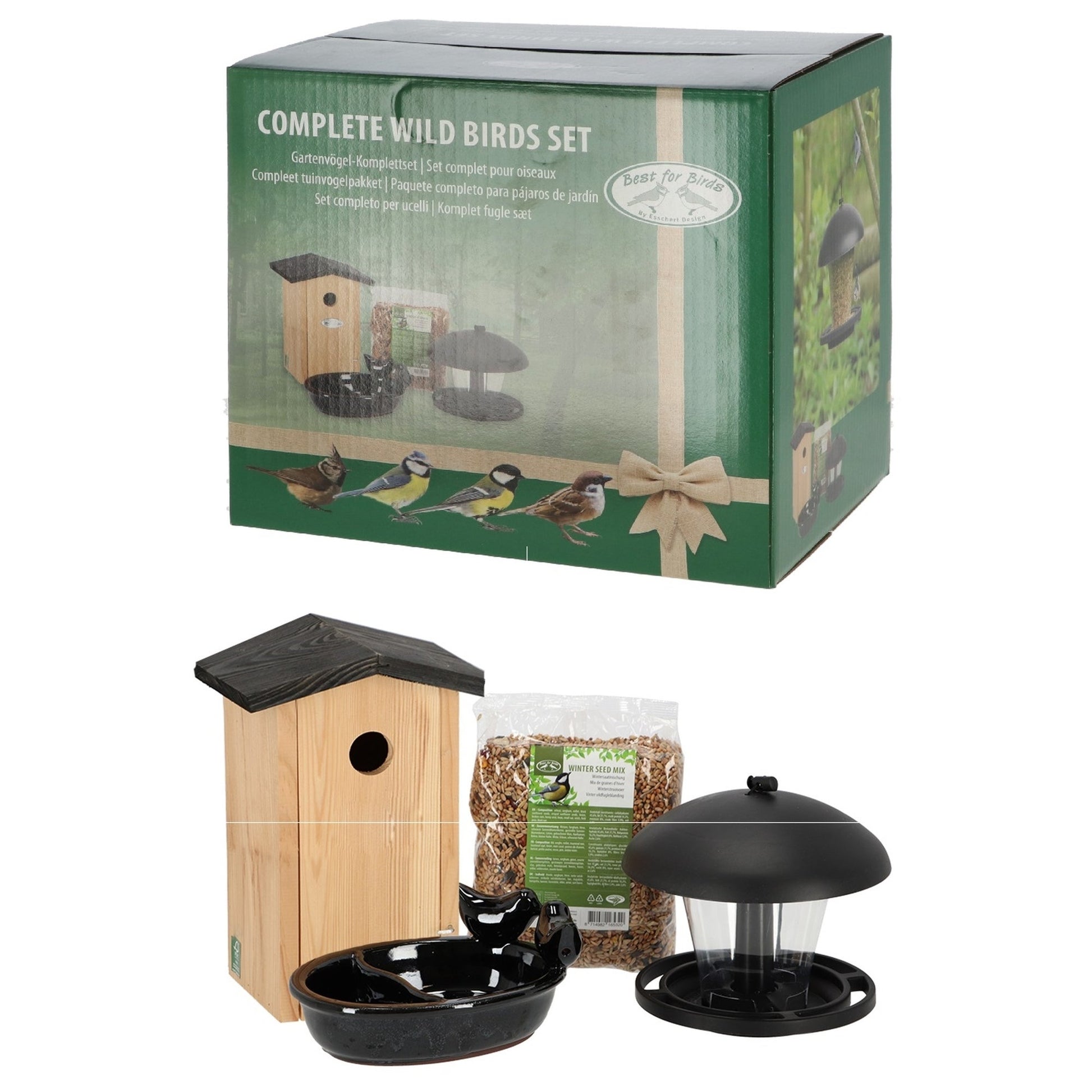Attract wild birds to the garden! This kit contains everything needed to take care of the birds in the garden. The set offers shelter and living space, a nice bath, a winter seed mix and a associated feeding system. Except for the blue tit, also the crested tit, marsh tit, willow tit and coal tit can be expected to visit the nesting box.- packed in a full colour gift box- complete set- including a winter seed mix and feeding system- including nesting box