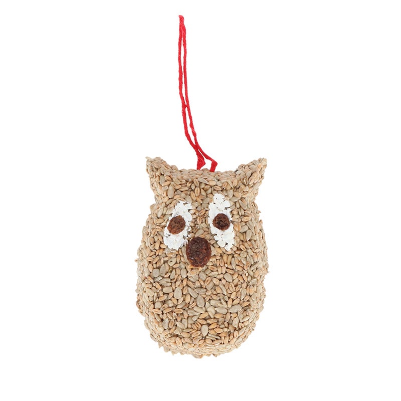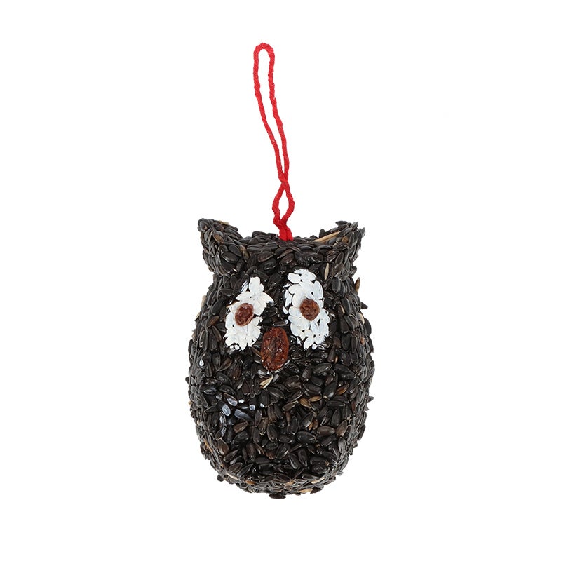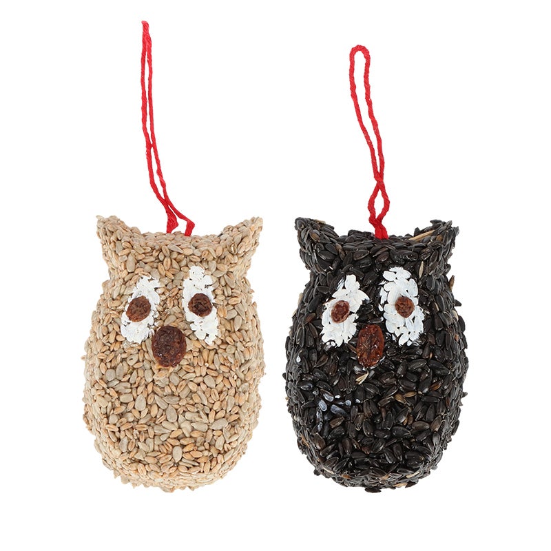 This bird food in the shape of an owl comes in two different types. This high-energy bird food consists of sunflower seeds, wheat and raisins.- high energy bird food