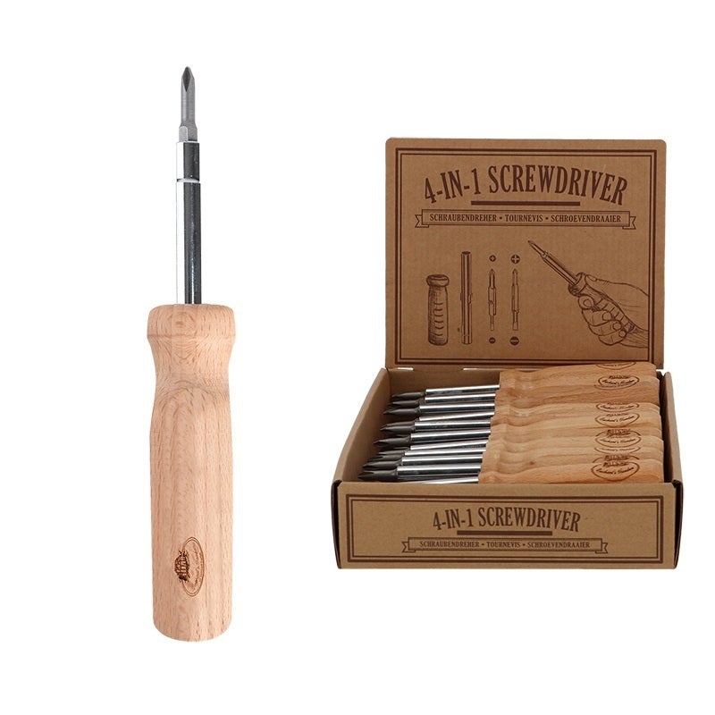 This screw driver is provided with a wooden handle and four different bits.- natural- wooden handle- 4 different bits- packed in a table display