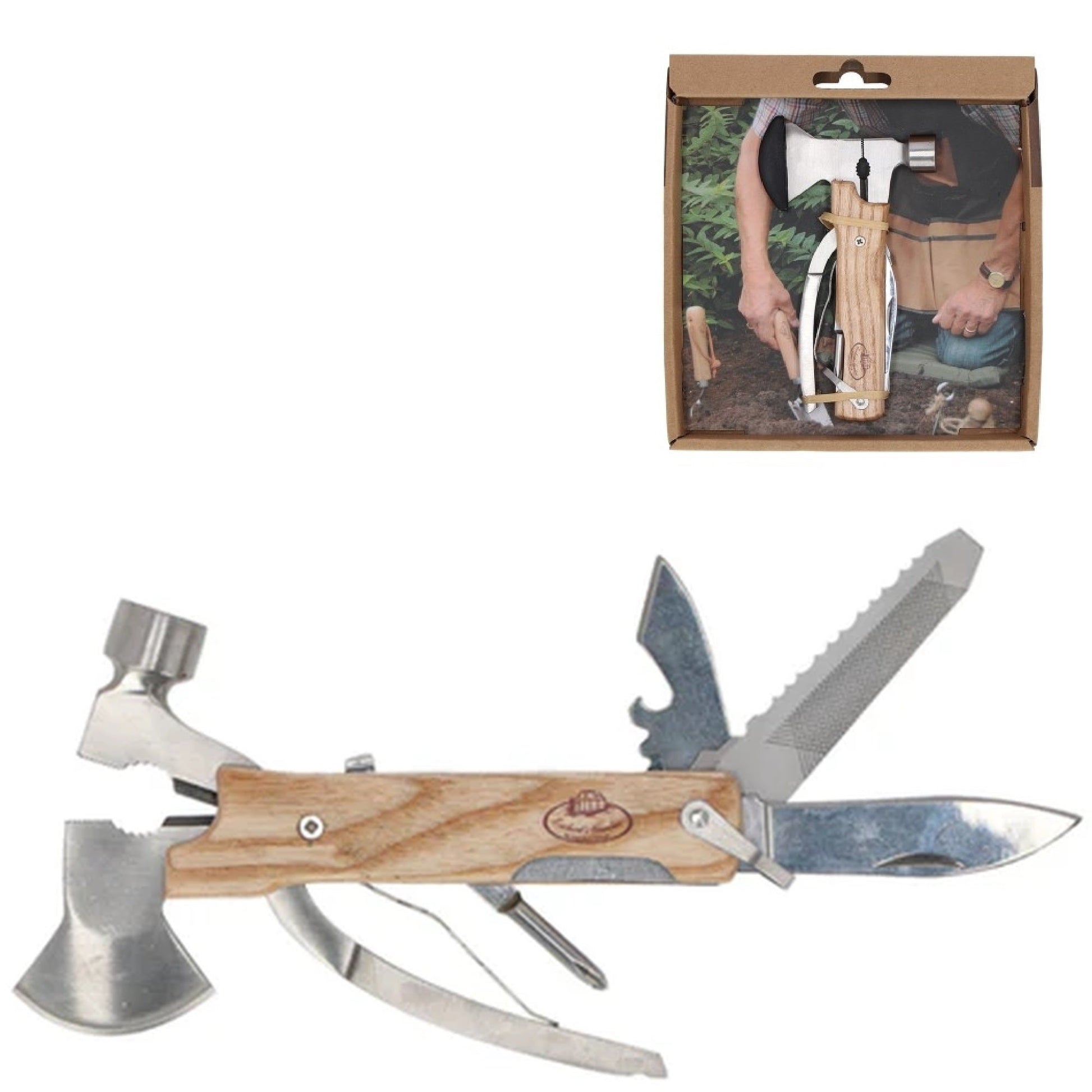 Want to have all your tools close to hand? This compact multi-tool hammer is a handy tool that can be used for jobs in and around the house and garden. This compact hammer contains no fewer than 9 tools: a flat head screwdriver, saw, bottle opener, hammer, pliers, axe, Phillips screwdriver, pocket knife and a file. You can easily switch between the different tools. The multi-tool hammer is made of sturdy stainless steel in combination with European ash wood. Its compact size makes the hammer easy to use. - has 9 functions- packed in a beautiful gift box