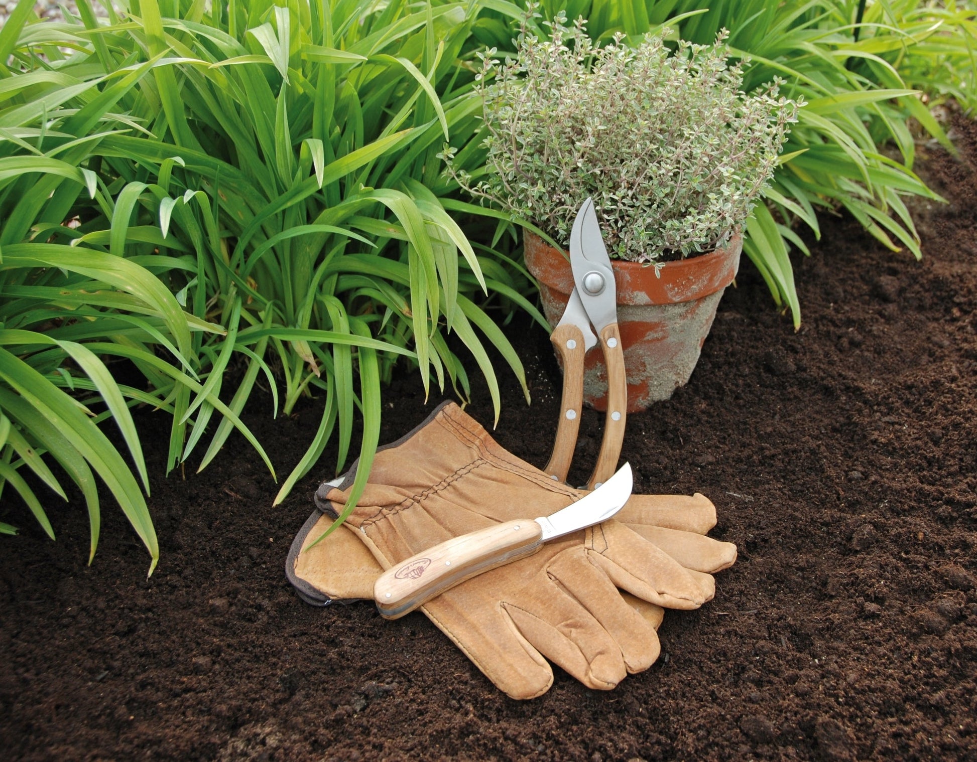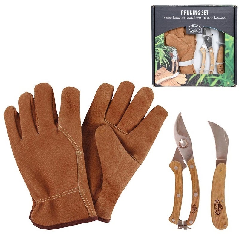Traditional pruning set for anyone with a green thumb. The durable choice in material of this tool means it will last a long time. This set is the basis for small pruning jobs in the garden. These pruning shears are suited for pruning buds, pruning flowers and picking fruit. The pruning knife with recognisable bent blade is perfect for carving, cutting and grafting, pruning branches or cutting flowers. The sturdy pigs leather gloves with an authentic feel protect hands from dirt and thorns.- set consists of pruning shears, pruning knife and leather gloves- pruning shears come with lock in the back and ergonomic handle- foldable pruning knife- packaged in full colour open giftbox