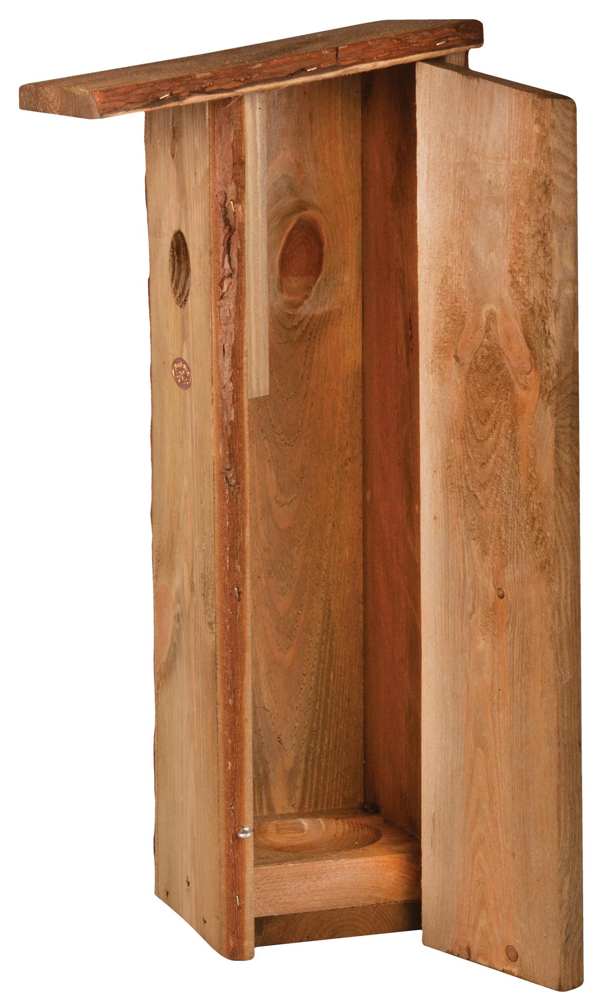 This nesting box is specifically designed for woodpeckers. This nesting box has a extra thick bowl shaped bottom for the eggs and a closed entrance the birds need to open themselves, just as in nature. In the winter the nesting box ideal for bird that need to take shelter from the elements. Including a door to open the box for cleaning.- closed entrance hole- thick bowl-shaped bottom- door on the side