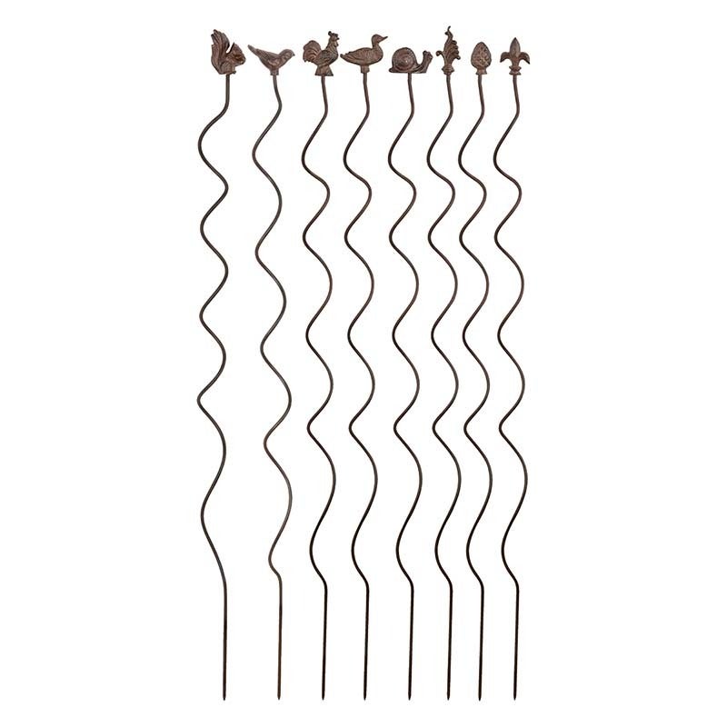 Assortment of 8 cast iron plant supports spirale with decorative head. Size stick:ø 0,7 cm. Length: 125 cm. Available in heads: French lily, pine cone, rooster, banner, squirrel, snale, duck and bird.