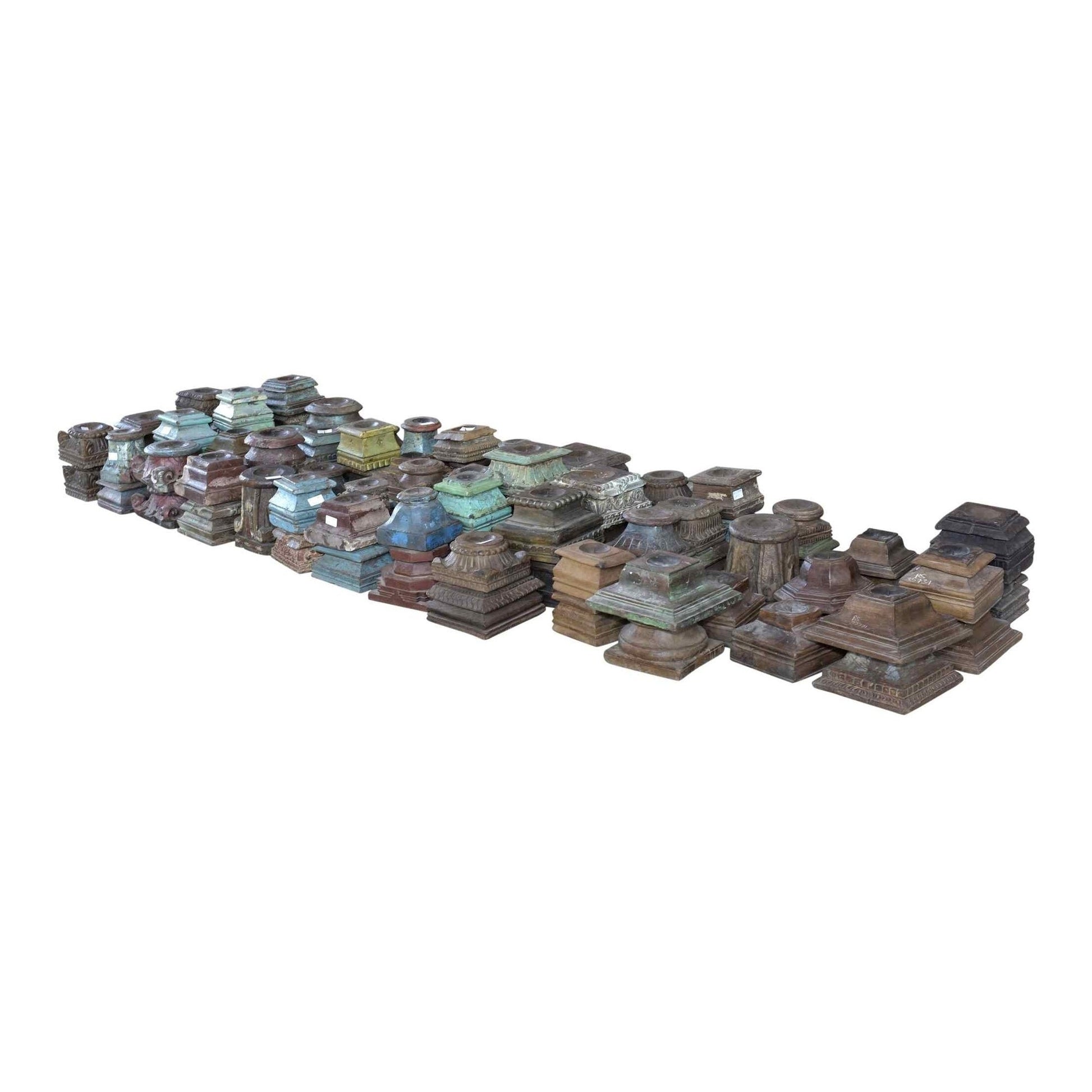 This collection of vintage wooden candle stands offers a charming variety of styles, each piece uniquely crafted and showcasing its own distinctive design and patina. Made from reclaimed wood, these candle stands feature rich textures, intricate carvings, and a range of finishes, from natural wood tones to faded blues and greens, adding a rustic, antique appeal. Perfect for creating an eclectic display on a mantel, table, or as part of a centerpiece, these stands bring warmth and character to any space. Ideal for those who appreciate one-of-a-kind decor with historical charm.