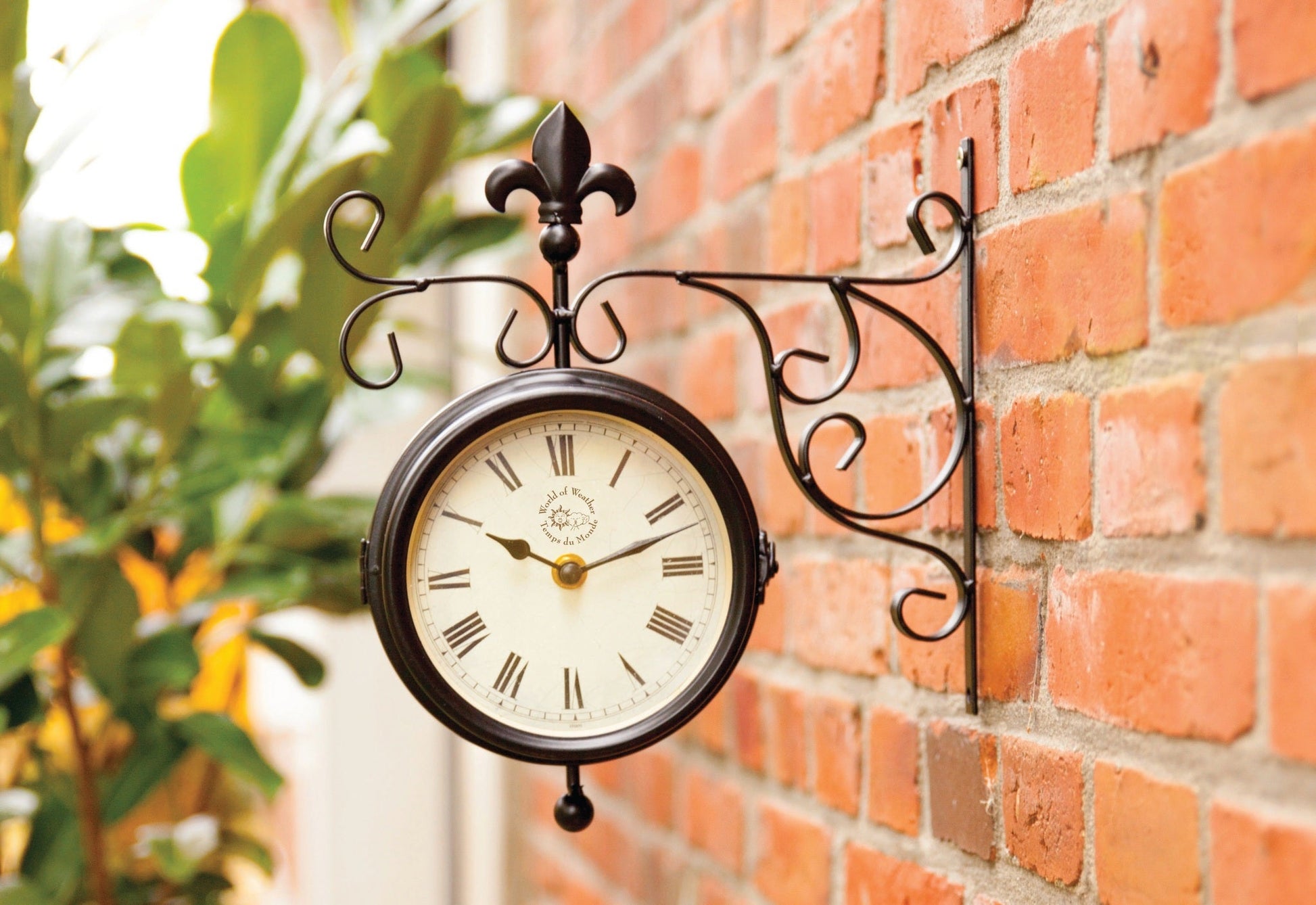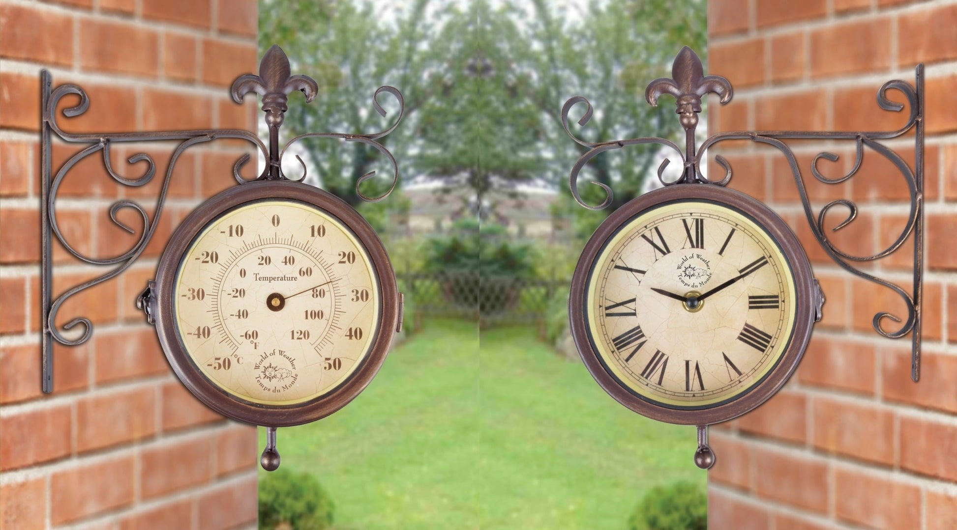 Double faced outdoor clock with thermometer. Indicates temperatures between: -50?C - 50?C / -58?F - 122?F. Packed in giftbox.