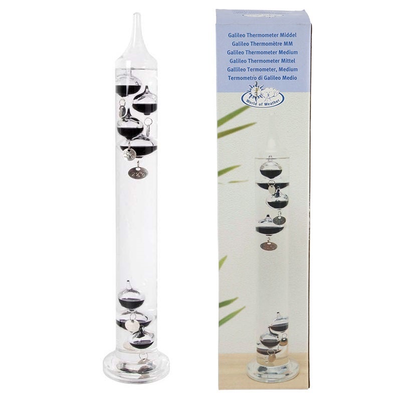 Medium sized Galileo thermometer. Indicates temperatures between: 26?C - 18?C / 80?F - 64?F. Packed in a gift box.