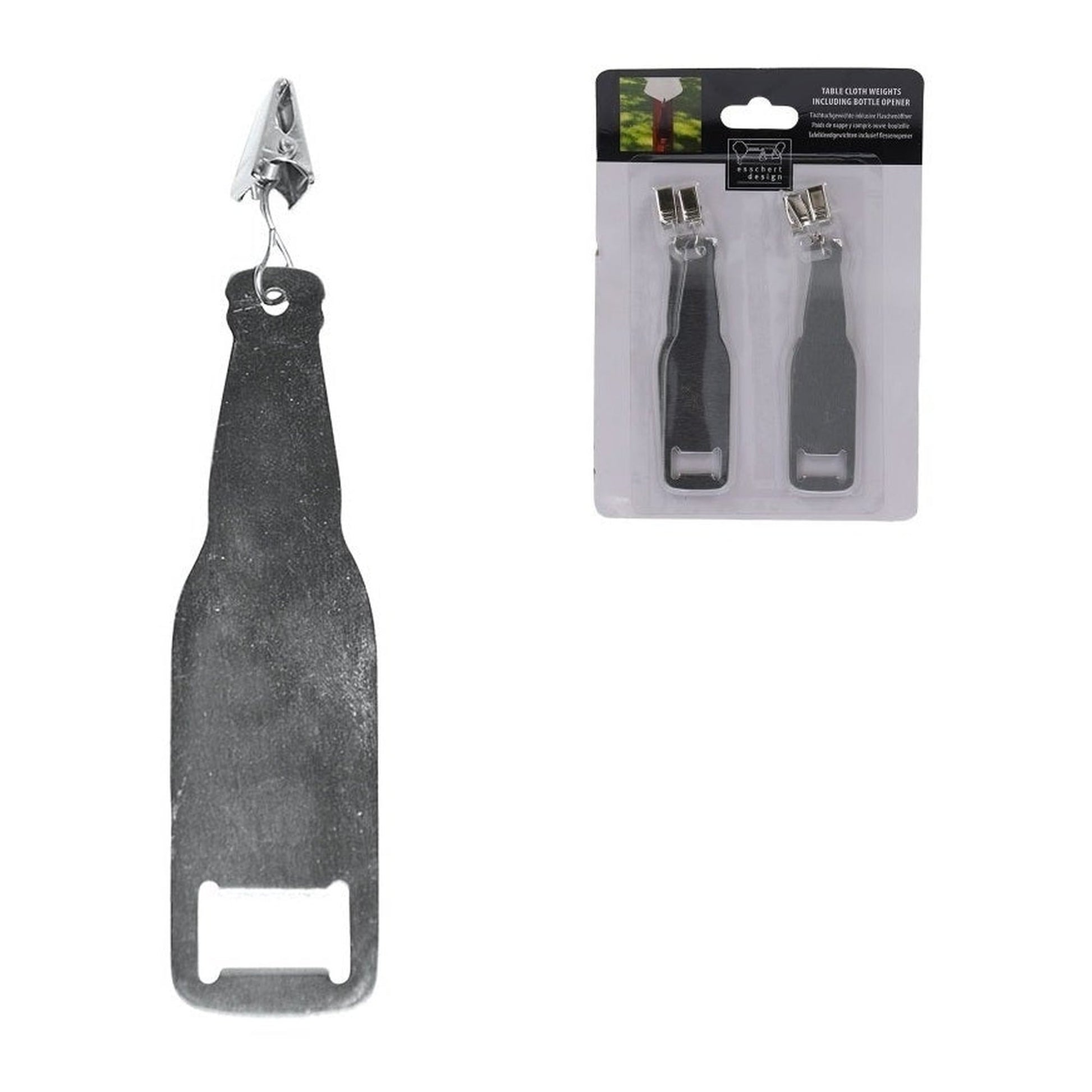 These table cloth weights are bottle shaped and hold down your tablecloth when the wind starts to blow. Each table cloth weight has a built-in bottle opener.- set of 4- built-in bottle opener- packed on a headercard, packed in tabledisplay