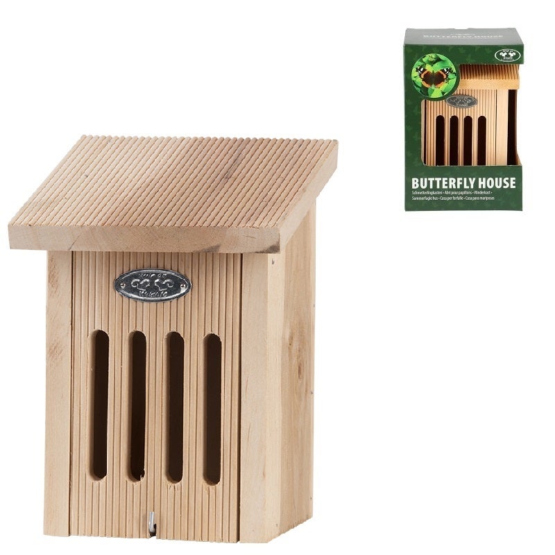On the beautiful hot and sunny days during summer you will seebutterflies everywhere. On cold days, however, they tend to keepin hiding. This house is the ideal hiding place for butterflies to seek shelter in bad weather conditions. In addition, they can use the box to hibernate. To make the butterflies more comfortable, you can place a handful of twigs in the box so that the butterflies can hang onto the twigs whilst using the house.- 15 mm thick walls which provide perfect isolation- Sloping roof, the water will flow off- Overhanging roof which protects from wind and rain- Front side is hinged for easy cleaning- Four drainage holes in the bottom- Sides enclose the floor to prevent water coming in- packed in a full colour gift box