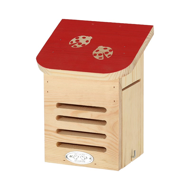 Apart from being a joy to watch, ladybirds are extremely useful creatures. An adult ladybird eats about 100 aphids per day, which is a good reason to make it them comfortable in your garden. The ladybird house is designed to allow ladybirds to shelter whilst keeping out other likely inhabitants or predators and that ladybirds can accessit easily. Ladybirds often hibernate in a group together and it is advisable to put some leaves or a corrugated cardboard roll inside to make them feel at home. Also frozen ladybird larvae can be put into this house for biological control of aphids.- coloured roof with silhouette- hinged side to open and clean the house- keyhole slot at the backside- packed with a booklet- water based wood stain- FSC® certified wood- Made in Europe
