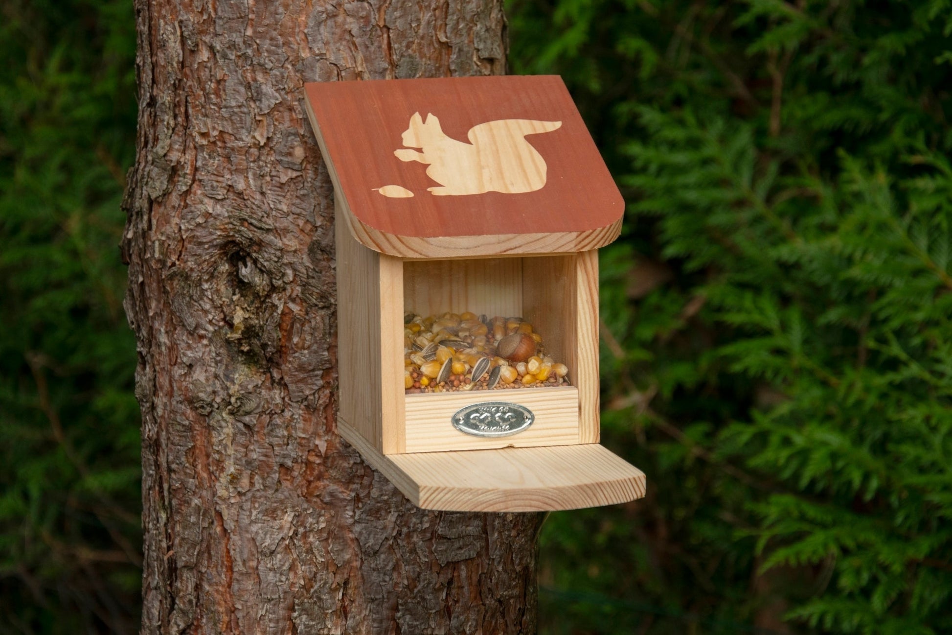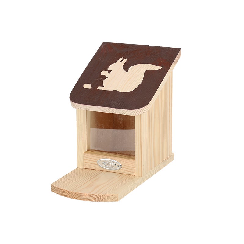Squirrels are quite the acrobats amongst trees and bushes. When it comes to searching for food, they are very clever. Squirrels like to eat peanuts, walnuts, hazelnuts and sunflower seeds, however squirrels often raid bird feeders, depriving birds of their own food. Squirrels can help themselves to nuts with this feeder and you can help avoid unnecessary raids on the bird feeders. They will eat on the spot or take it away and hide it in the garden, storing it for winter. These agile animals can be observed easily whilst they are eating.- coloured roof with silhouette- can be opened by lifting the roof- keyhole slot at the backside- packed with a booklet- water based wood stain- FSC® certified wood- Made in Europe