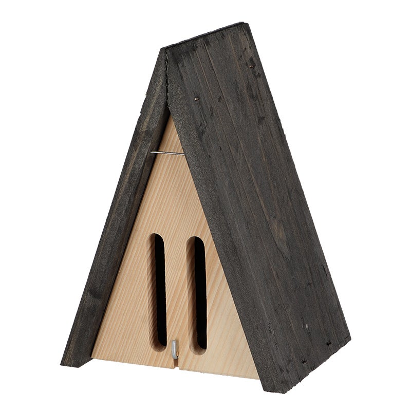 This butterfly house shaped like a wigwam with keyhole opening offers butterflies a good place to nest. Two vertical openings in the front allow the butterflies easy access. In addition to being an excellent place to nest, this house also offers a nice place to shelter when it rains. It is advisable to fill the house with twigs, so that adult butterflies can rest better and have a place to hide. In addition, the twigs provide a place for caterpillars to pupate. Pupating is the process by which a caterpillar develops into a butterfly. Specific twigs are also used as a food source for caterpillars. Due to its flat back, the butterfly house is easy to place against the wall. - keyhole opening- can be opened at the front- fittings not included