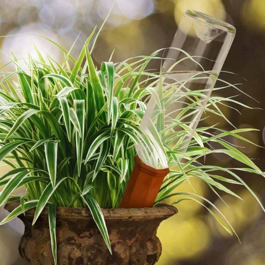 Watering spout. This spout can be placed on a bottle. Fill the bottle with water, put the spout on and place the bottle upside down next to the plant. Ideal during holidays.