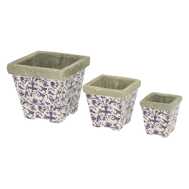 Set of 3 ceramic square flower pots with Aged Ceramic print. Volumes: 0,7 litre /2,2 litre / 4 litre. Weights: 0,6 kg / 1,68 kg / 2,94 kg.