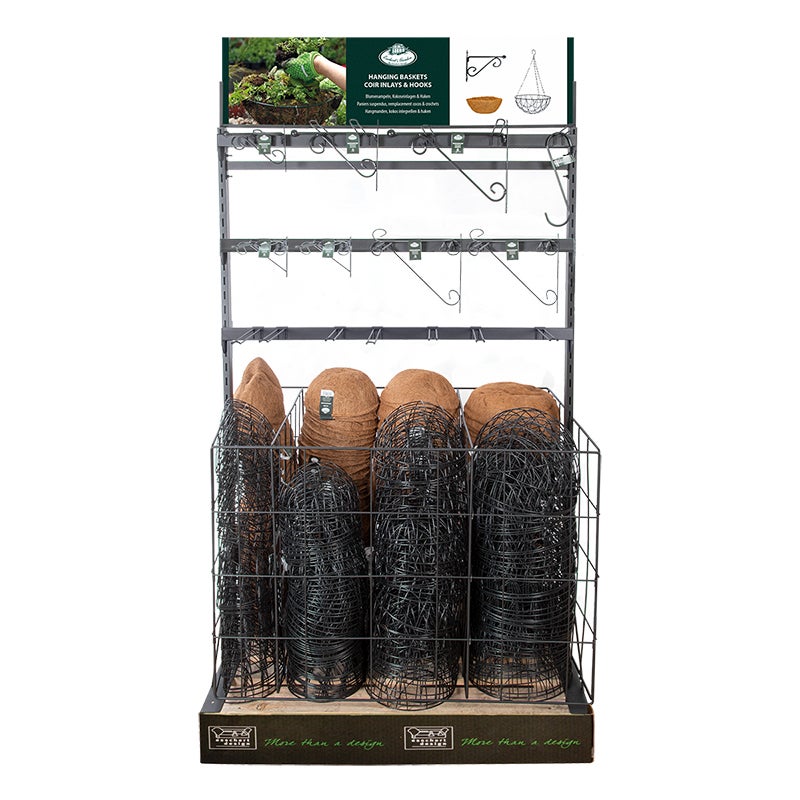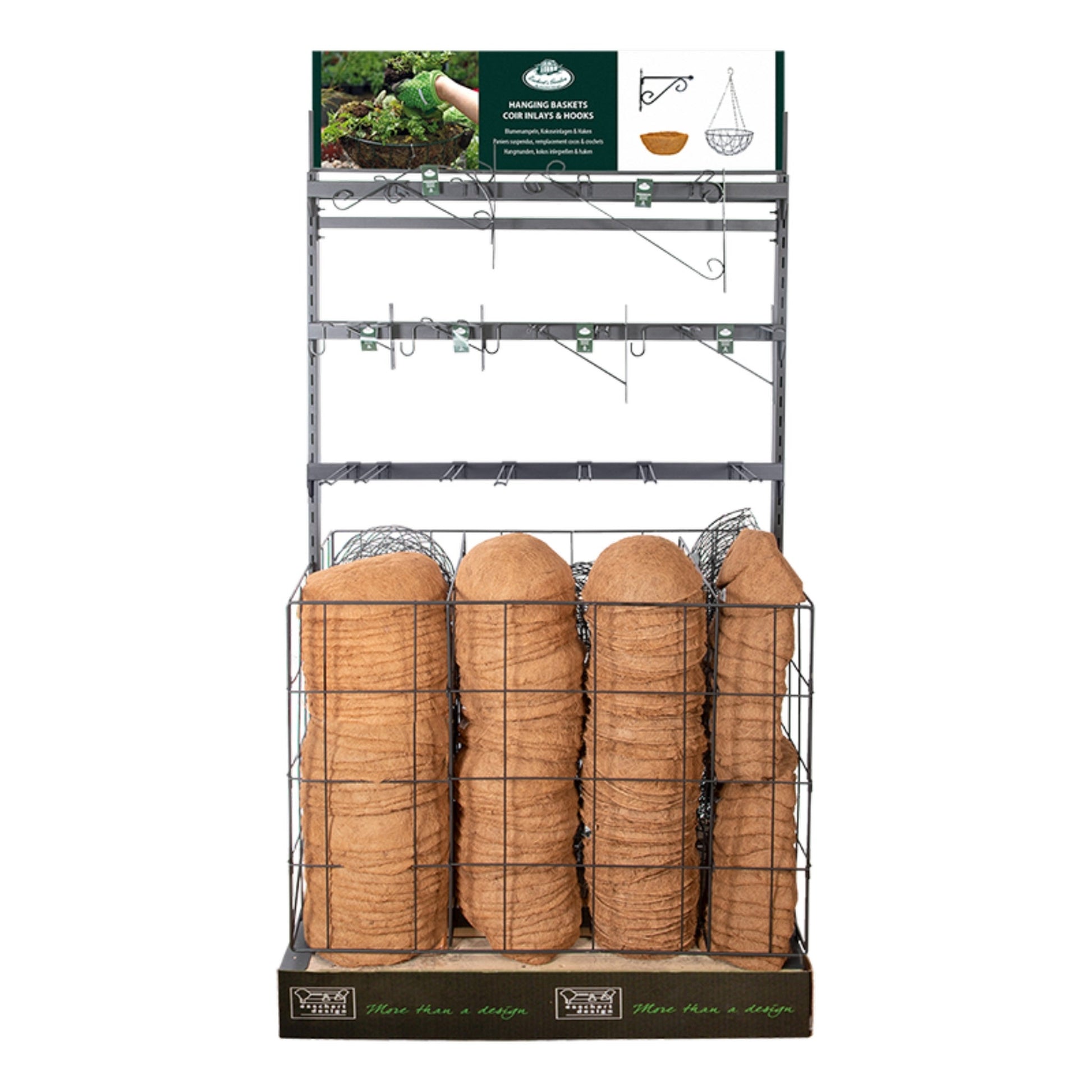This hanging basket display is filled with baskets in mutiple sizes, hooks in different designs and coir inlays. Including pallet, moodboard and pallet border.- including baskets in multiple sizes- including hooks in different designs- including coir inlays