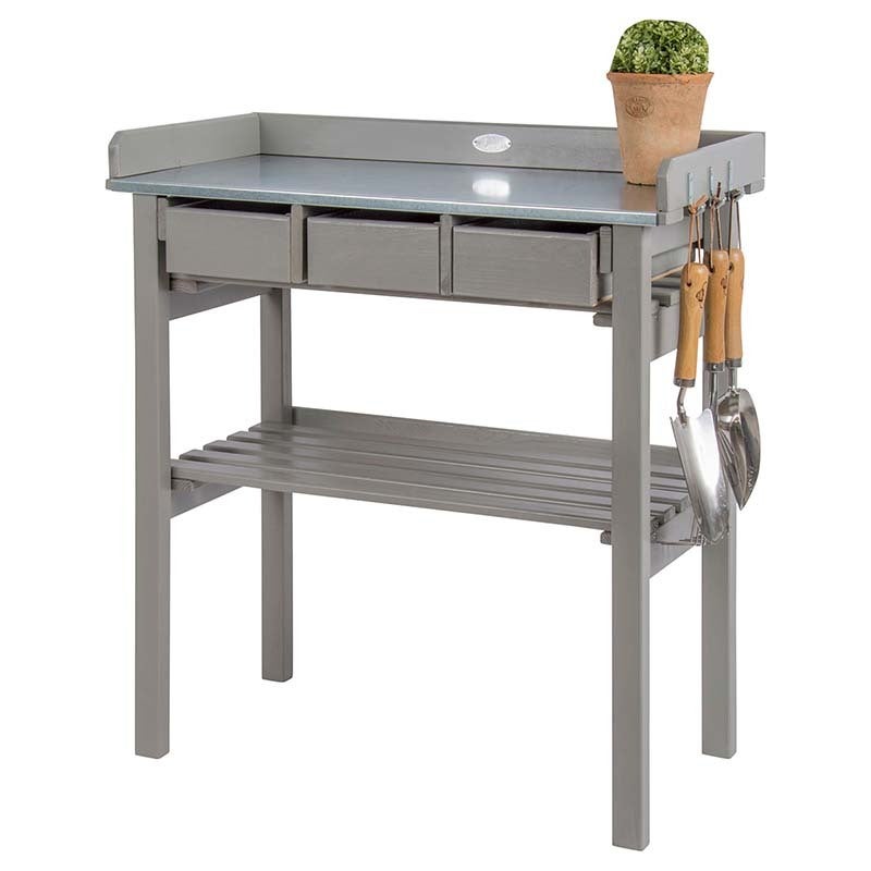 Sturdy and simple wooden furniture and accessories were a staple in the kitchen and living area of farms for many years, the high-quality wood provides superior stability and if finished in grey. This garden work bench not only adds atmosphere, but is at comfortable work height for any garden jobs. The zinc table sheet is weather proof and the three shelves and the tray underneath allow for easy storage of garden tools or other necessities. Small garden tools can also be hung from the three included hooks. - packaged disassembled in brown box with full colour sticker- produced in Europe