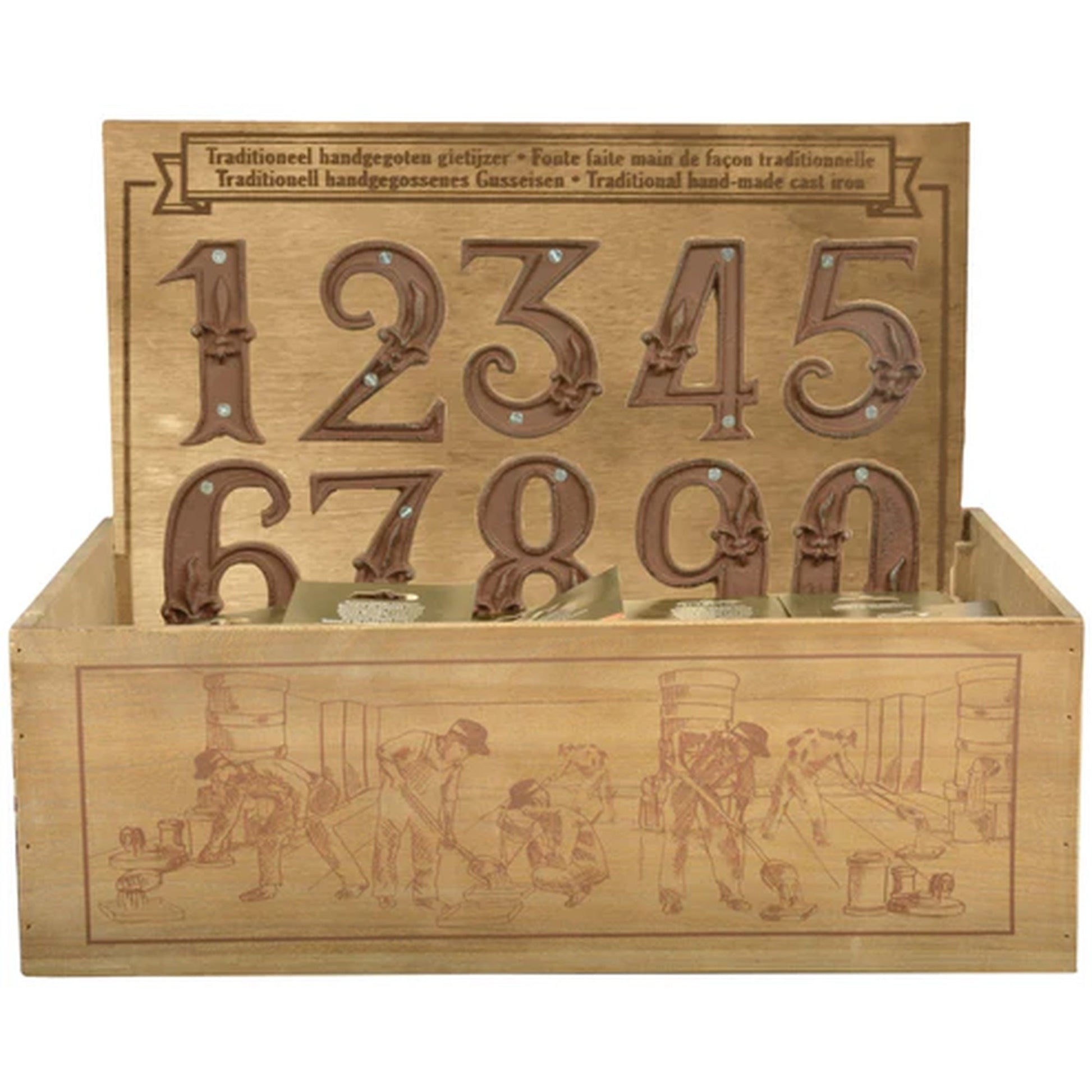 On February the 4th 1805 in the city of Paris people started using numbers to distinguish different house addresses and is the local calling card of your house. These decorative cast iron objects have each been hand cast according to centuries old tradition and craftsmanship. The house numbers are supplied in a wooden display box. The wooden lid, can later serve as a header for the display box.- the numbers are provided with two mounting holes- 100 pieces per display- fixings not included- contains:DB62-1 x 17DB62-2 x 13DB62-3 x 11DB62-4 x 10DB62-5 x 09DB62-6 x 08DB62-7 x 08DB62-8 x 08DB62-9 x 08DB62-0 x 08