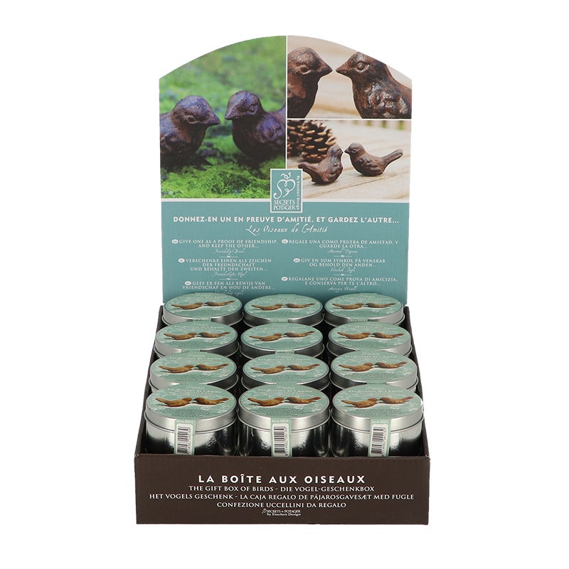Not just nice to use as a decoration in the house, but definitely also great to give to someone as a present. These two elegant birds are a show of friendship. Keep one for yourself and give the other bird to someone you hold dear. Each individual cast iron bird is hand cast according to age old tradition and craftmanship.- set of 2 friendship birds- packaged in metal gift tin- packaged in table display
