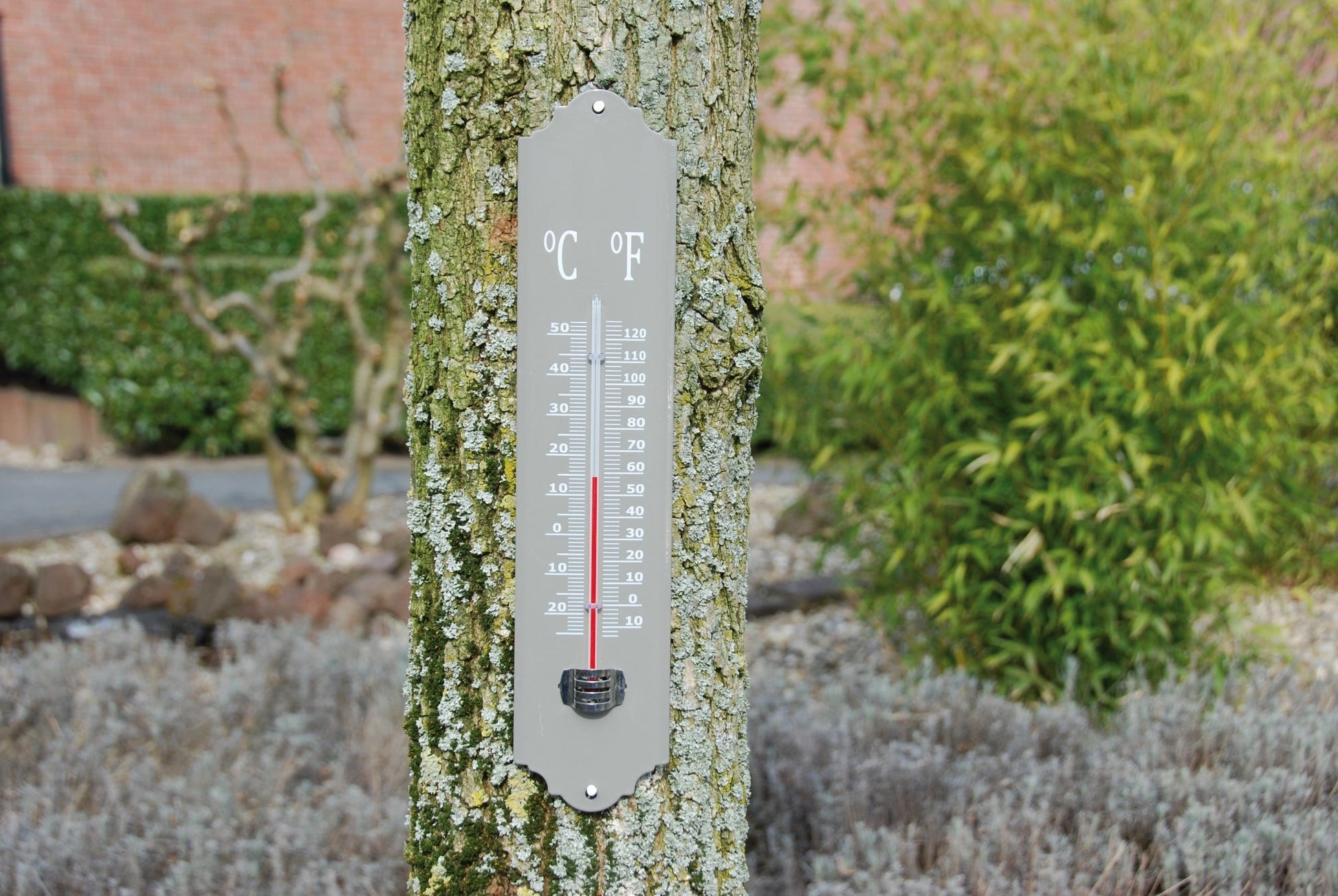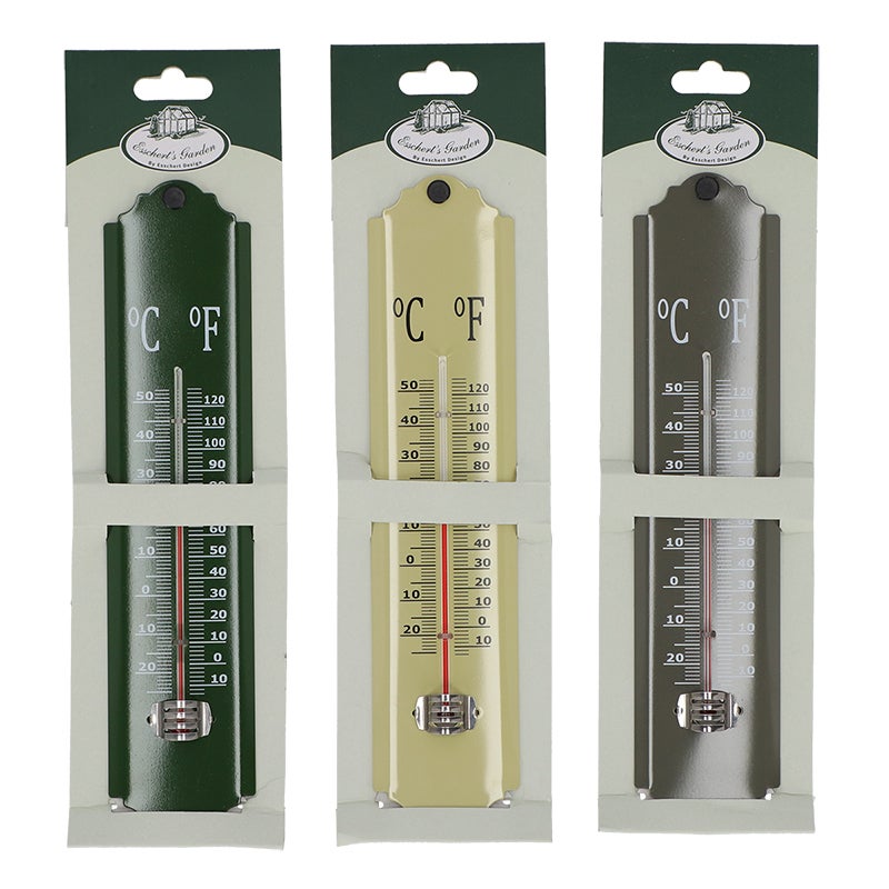 This metal thermometer indicates temperatures in both Celsius and Fahrenheit and is suitable for inside and outside use. The therrmometer can easily be mounted to the wall. Available in the colours: grey, white and green.The thermometer indicates temperatures between -25°C en +55°C. Packed on a card with eurolock.- assortment of 3 colours- for inside and outside use- can easily be mounted to the wall or fence