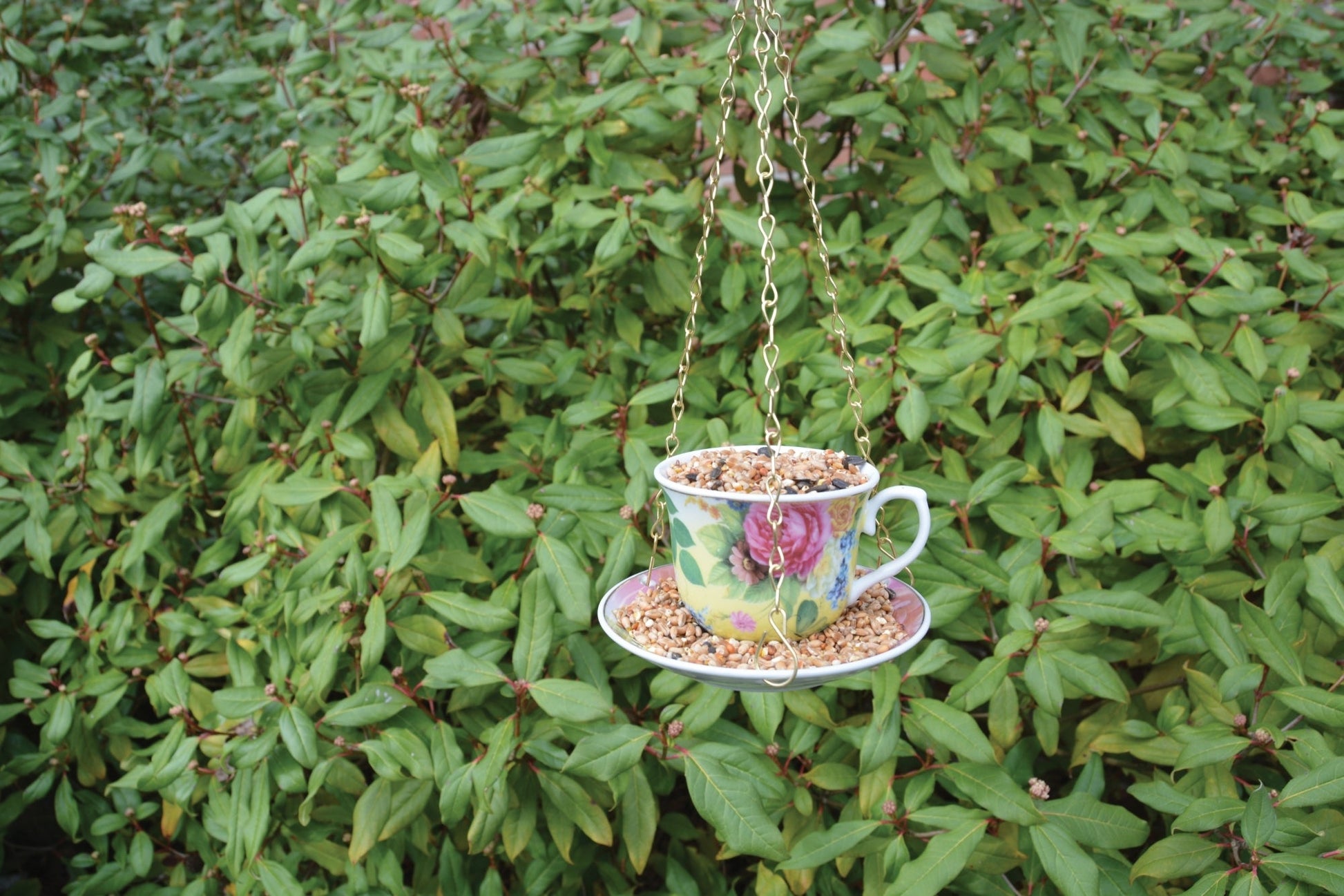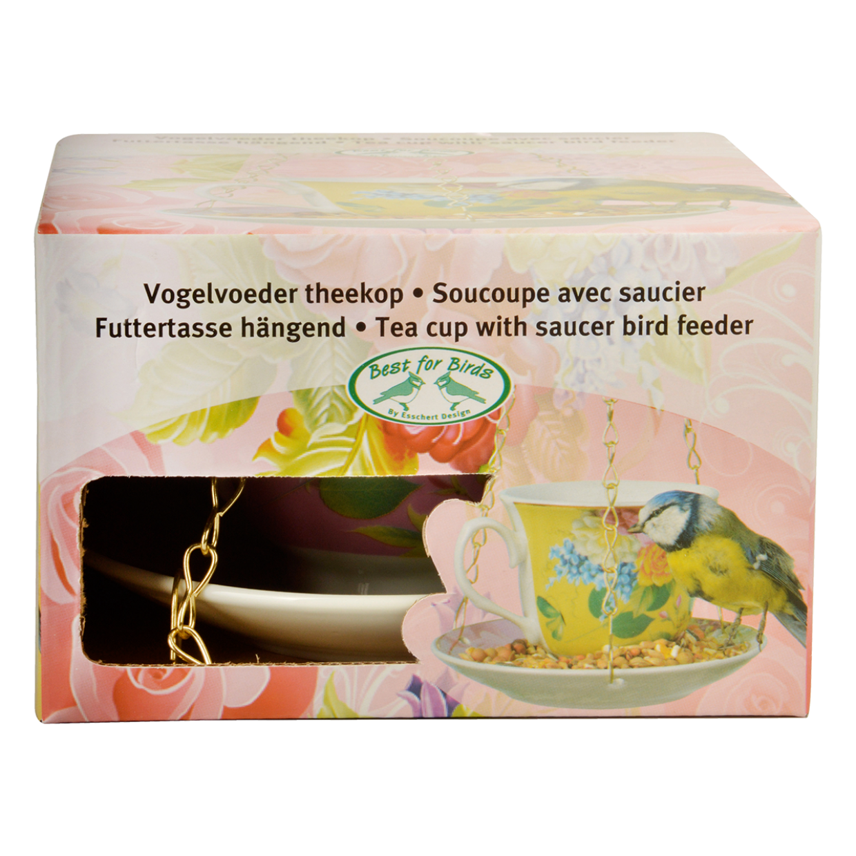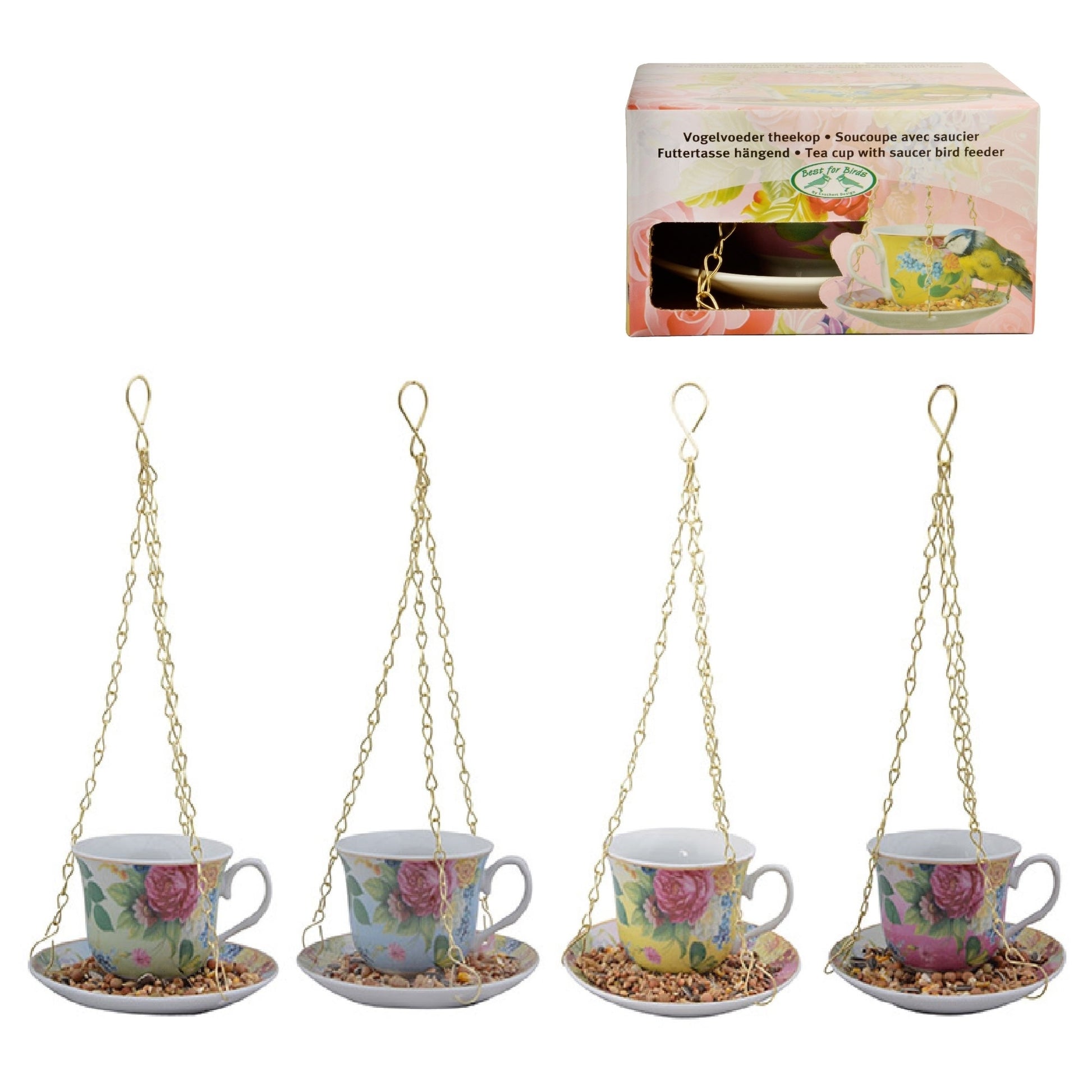 Tea time for birds! Grandmothers tea set offers birds a place to feed. The tea crockery makes this feed hanger feel nostalgic. This article is a combination of a feeding tray and a watering tray. Thanks to the included chain this cup can be suspended anywhere.- including metal suspension chain- packaged in giftbox- assortment of 4 colour combinations- fixtures not included