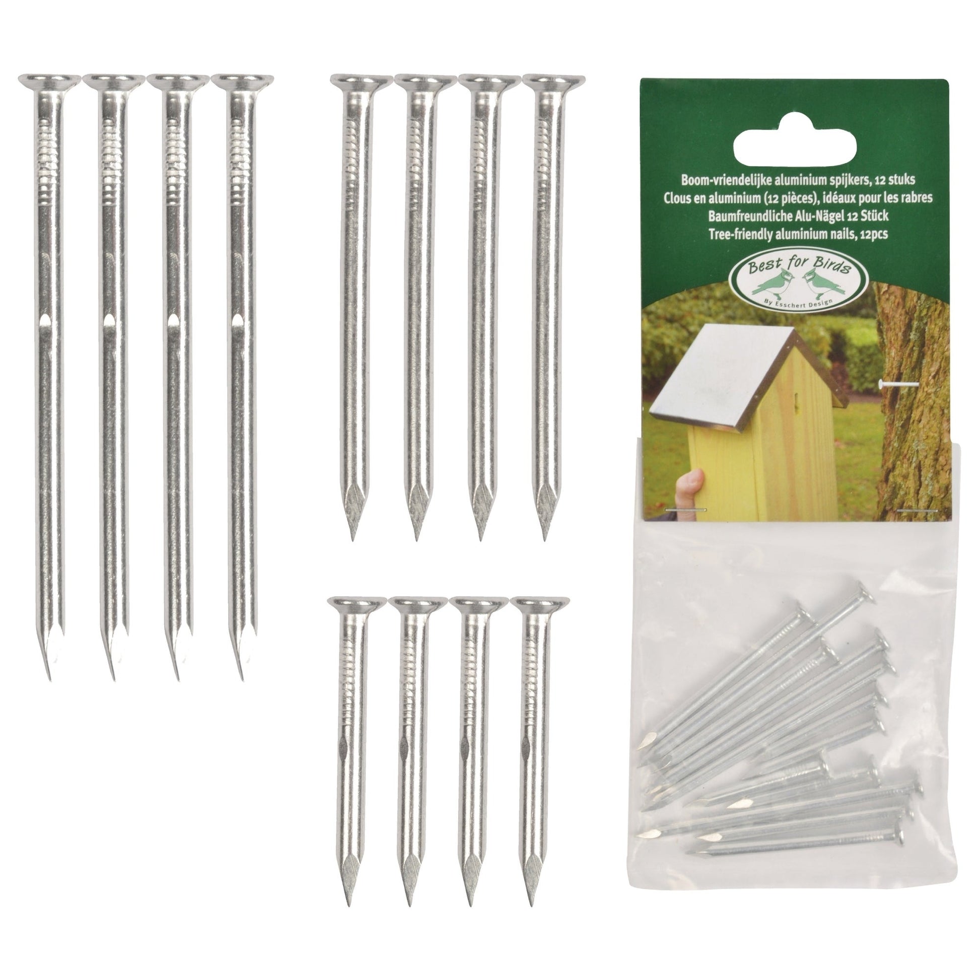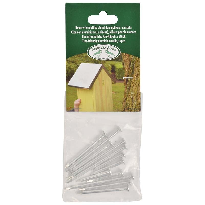 Aluminium nails are not harmful to trees like copper or old rusty nails are. These tree friendly aluminium nails are ideal for mounting nest boxes, feeder and signs to trees. The set includes 12 nails in three different lengths 4.5cm (1.77"), 6.5cm (2.56") and 8.5cm (3.35). - packed in poly bag with car and euro-lock