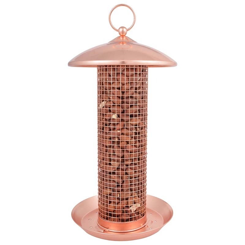 Fill this modern copper silo with nuts or peanuts. The open structure allows the birds to approach the feeder from all sides and enjoy the feed. The tray on the bottom helps ensure that feed and nutshells don’t fall on the ground but remain in the silo. the tray has comes with drainage holes to ensure that the feed doesn't sit in excess water and spoil. And can be refilled by the screw lid at the top of the feeder. - open structure. - catchment bowl for nuts and shells, with drainage holes.