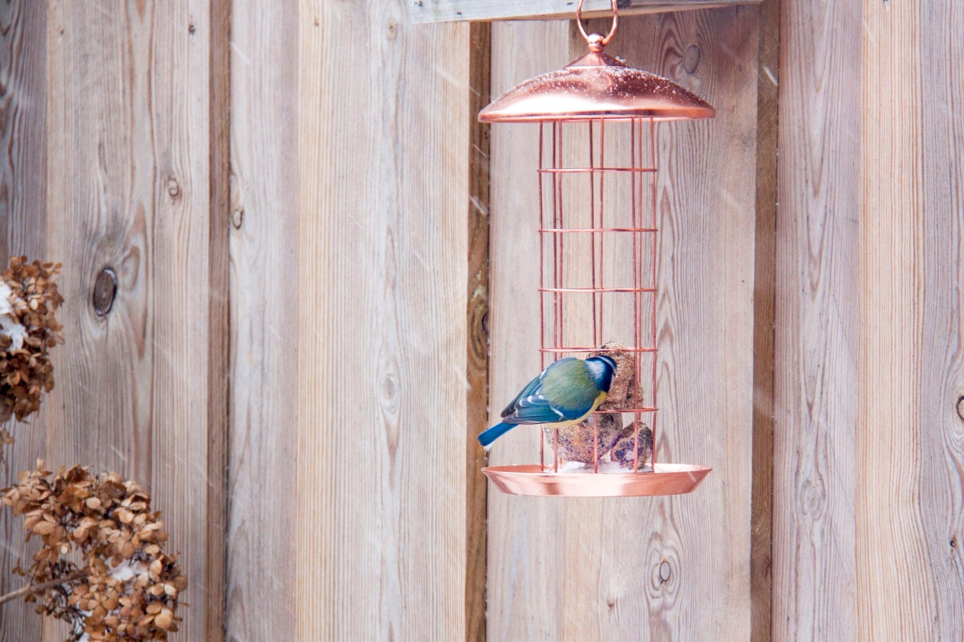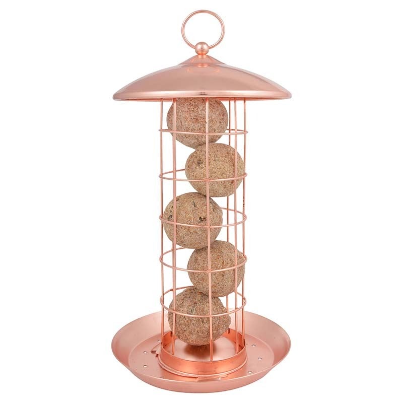 This modern copper suet ball dispenser can take 5 suet balls. The open structure allows birds to approach from all sides and enjoy the suet balls. The tray on the bottom helps ensure that nothing falls on the ground and remains in the silo. Apart from that the bowl has holes to drain the rainwater and ensures that the feed will not remain lying in the water. And can be refilled but the screw lid at the top of the dispenser.- suitable for 5 suet balls- catchment bowl for feed, with drainage holes