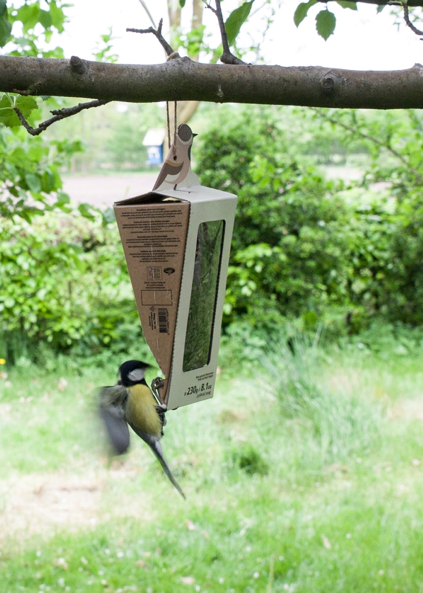 This feeding wedge with black sunflower seeds is ready to be suspended and put to use. A separate bird feeder is unnecessary, with this triangular cardboard silo filled with feed and supplied with a cord so that it is quite easily suspended anywhere in the garden. Two perforated areas on the back will upon pressure open up to allow you to offer feed to several birds at the same time. Thanks to the transparent window on the front it is possible to see how much feed is left in the package.- assortment of 4 designs- filled with black sunflower seeds- including natural jute rope