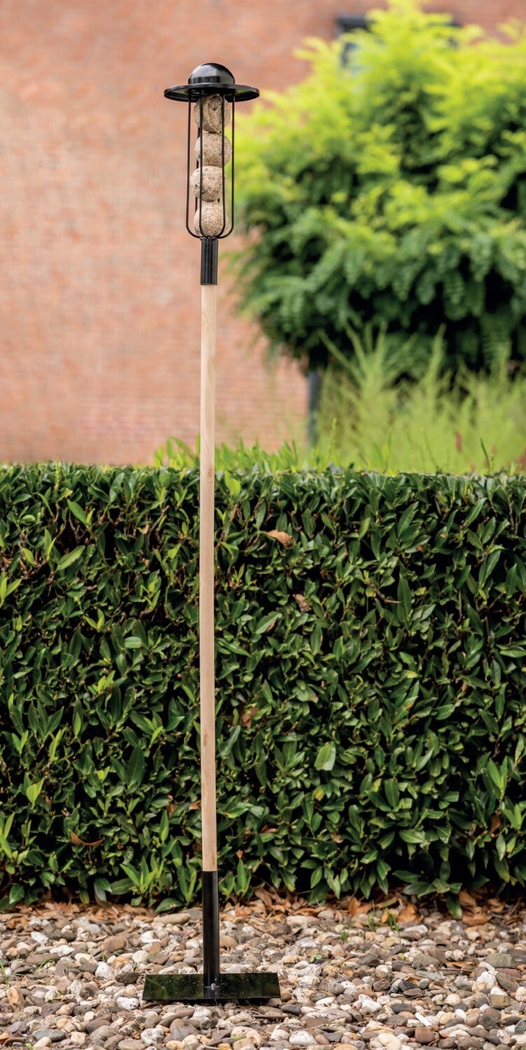 It is not always possible to hang a feeder. This suet ball feeder on a stick can be placed in a flower bed or on a terrace. A special foot is available (FB 477).- open structure- special foot (FB477) available- wooden stick included