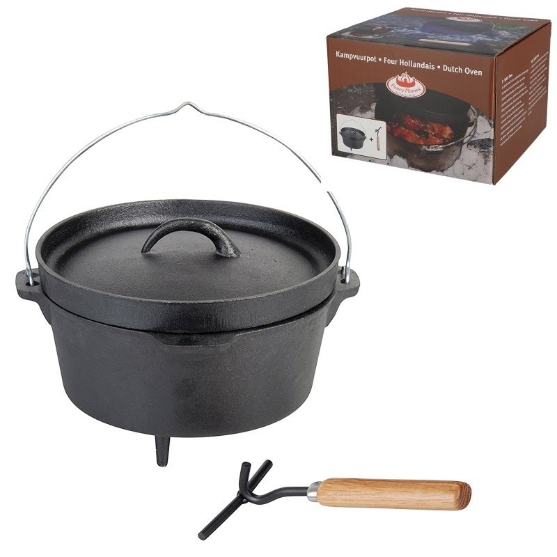 A Dutch oven is a traditional thick-walled cooking pot made of cast iron and has been used for many centuries, the cast iron construction ensure that heat is spread evenly across the Dutch oven heating the food from all sides. Coal or briquettes can be placed on top of the lid to create extra heat. It has a firm footing in or on the fire thanks to its three legs, alternatively the Dutch oven can be hung above the fire thanks to the handle’s suspension hook notch. The lid hook included makes it easy to remove the lid without using your hands.- packaged in gift box- including lid hook