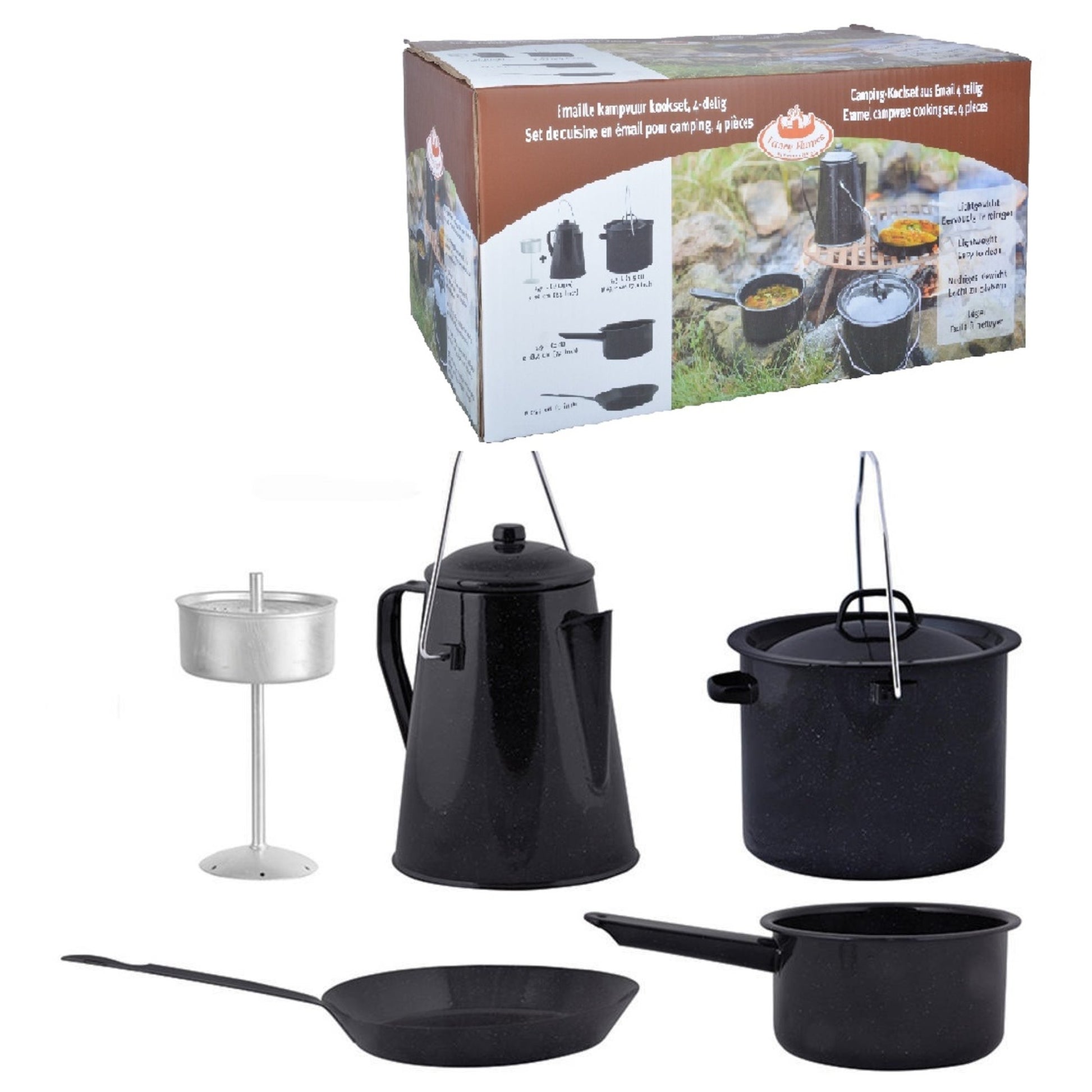 Cooking outside is an experience, an adventure. Prepare the most delicious meals with this complete 4-part set, consisting of frying pan, saucepan, cooking pot with lid and handle and coffee pot with lid and handle.- 4-parts: frying pan 25,.4 cm (10”), saucepan 1.9 L (3.3 UK Pints) 18.4 cm (7.2”), cooking pot with lid 3,3 L (5.8 UK Pints) 19,2 cm (7.6”), coffee pot (percolator) 1.9 L (3.3 UK Pints) (8 cups)16 cm (6.3”)- lightweight- easy to clean- packaged in gift box