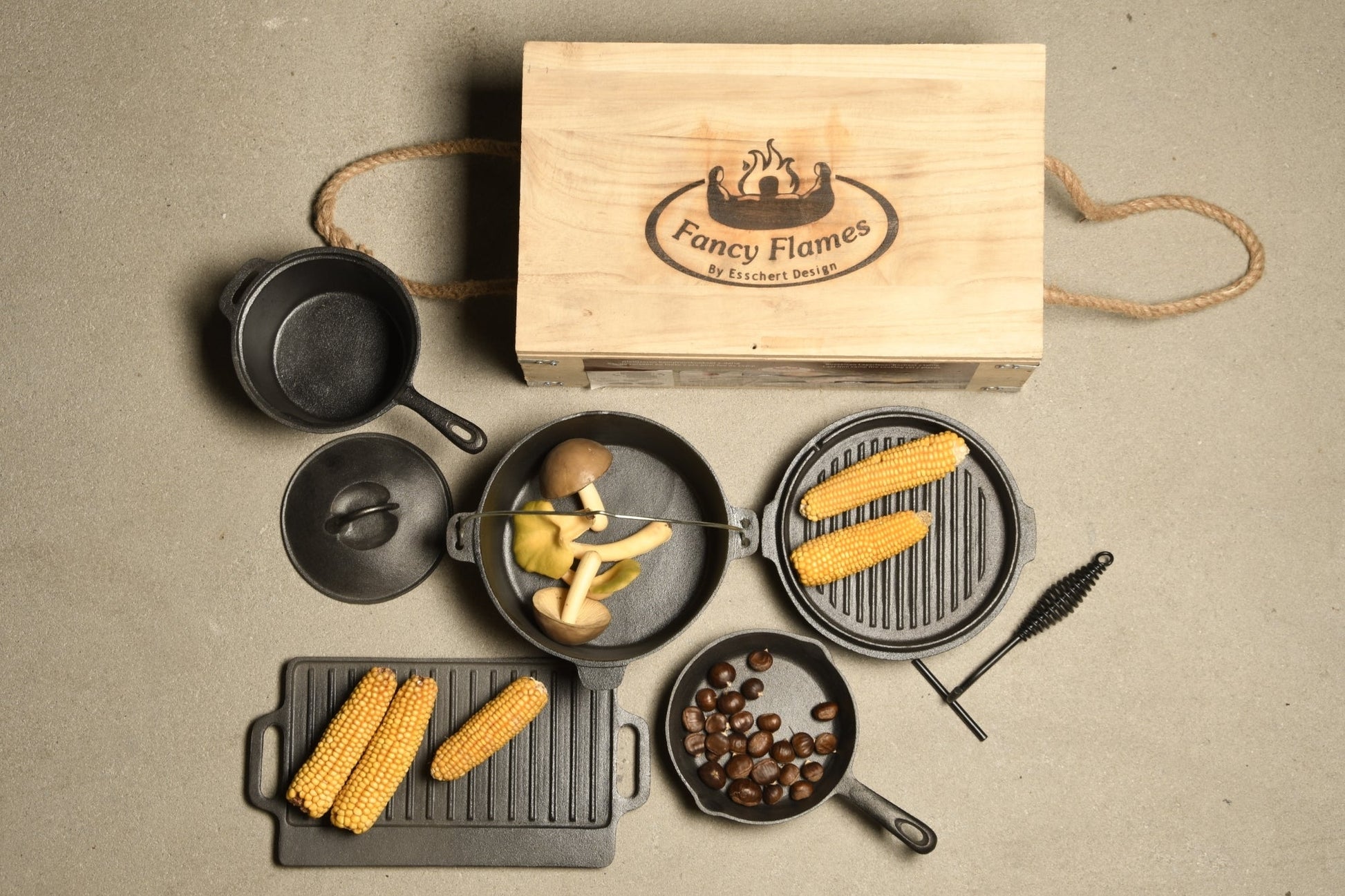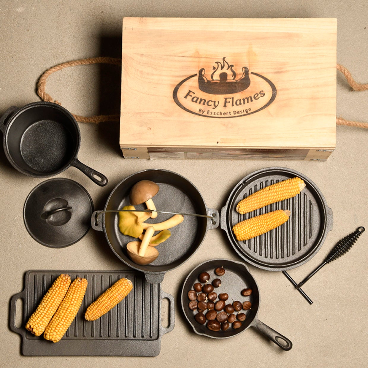 Cooking outside is an experience and an adventure. Prepare the most delicious meals with this complete 7-part set, consisting of campfire pot, frying pan with spout, reversible grill with handles, saucepan with lid and handle. All parts are packaged in a wooden crate with rope handles making it easy to take with you, there is also enough room in the crate for extra cooking utensils.- packaged in wooden crate with rope handles- 7-part