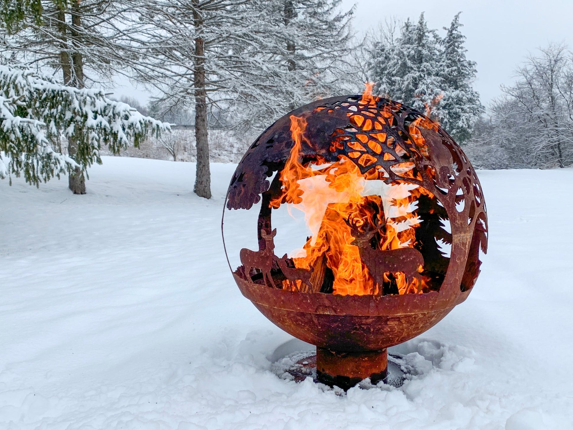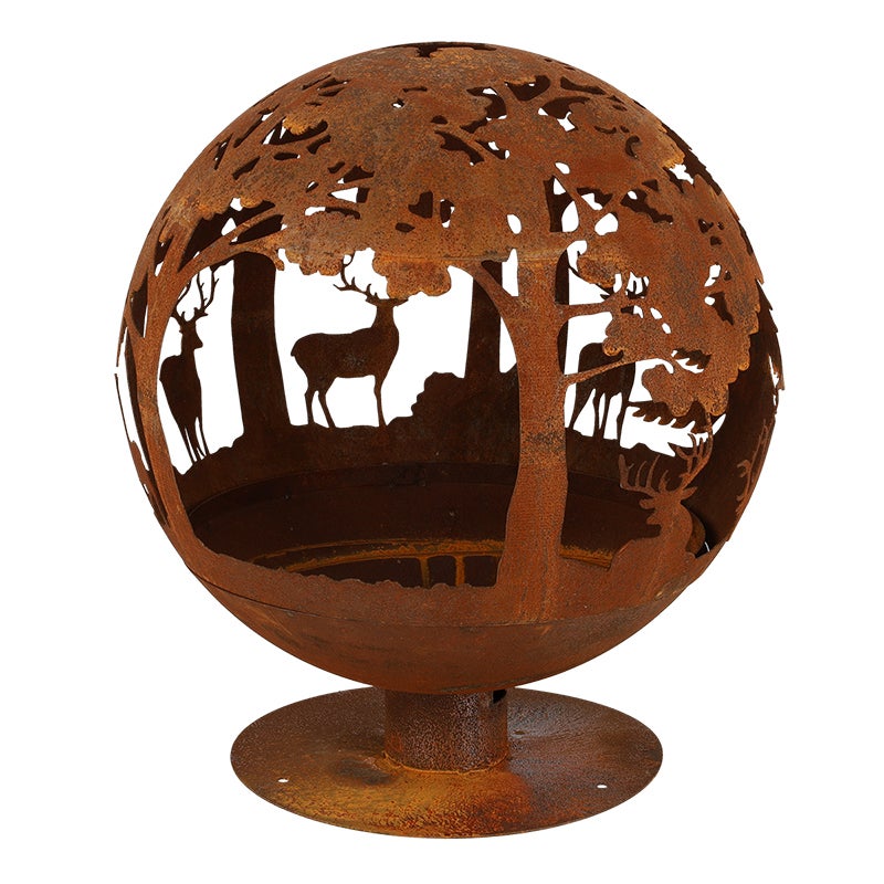When metal oxidises it creates a beautiful and authentic rusty appearance. A fire in the garden can create a cosy atmosphere that really catches the eye. This round fire ball has laser cut shapes of trees and deer, which creates a beautiful spectacle when in use, while using this item the rust effect caused by fire, weather and time will make the patina even more authentic.- laser cut design- 2-part- large opening for placing wood