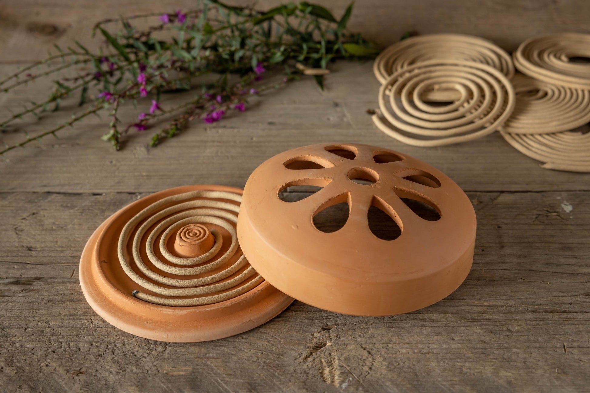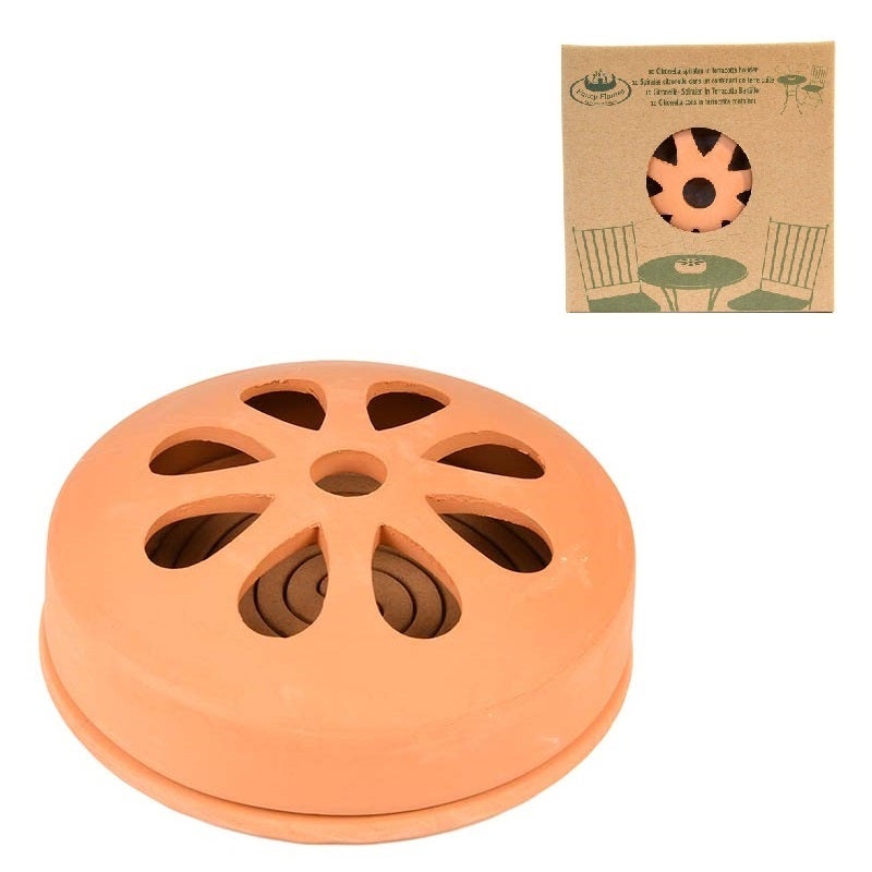 Citronella is used to fend off insects without killing them. The coils give off a scent that keeps insects at bay, this all natural and animal friendly insect repellent is perfect to use in the garden during the summer months.- set consists of terracotta holder and 10 citronella coils- burning time 6 to 12 hours per coil- packaged in gift box and table display