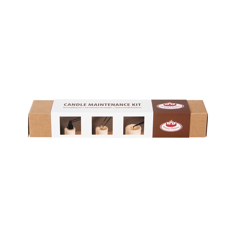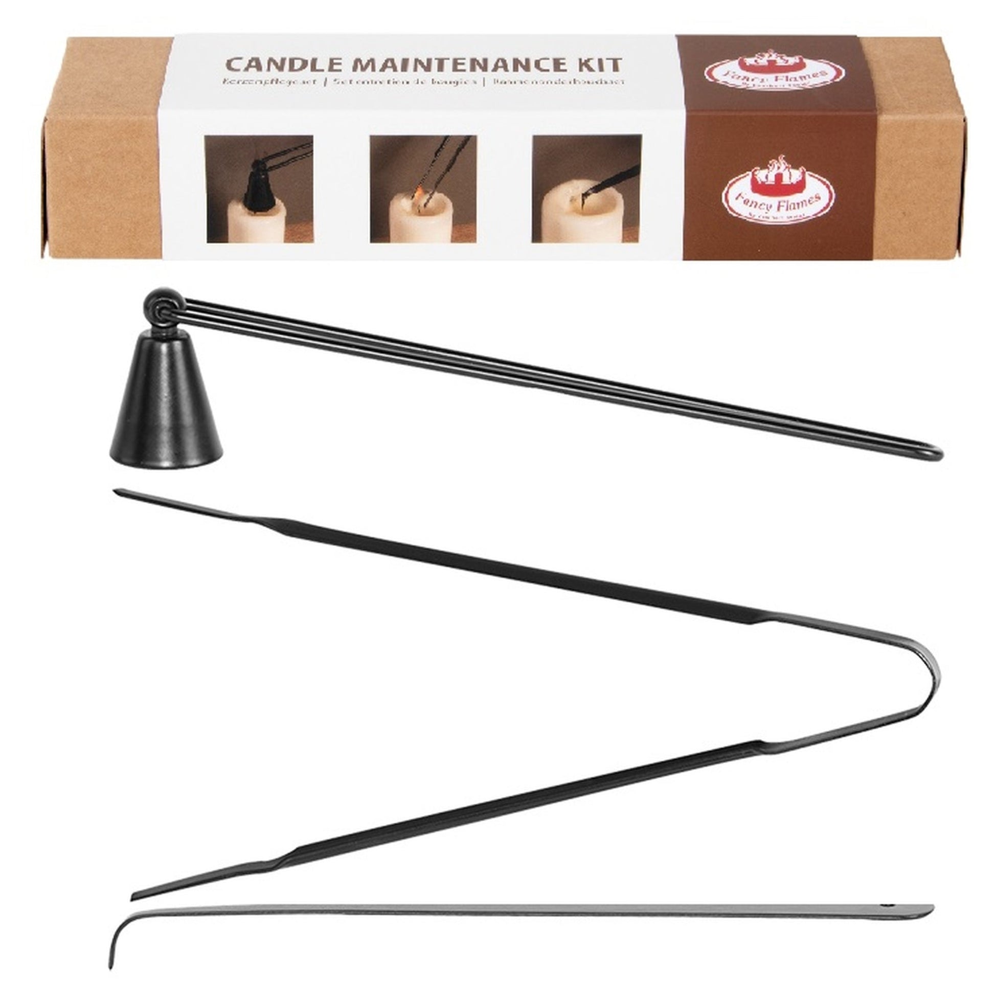 Keep the candles bright and clean with this maintenance set consisting of a wick trimmer, wick dipper and candle snuffer. - in trendy black- including trimmer, clipper and snuffer- packed in a matchbox