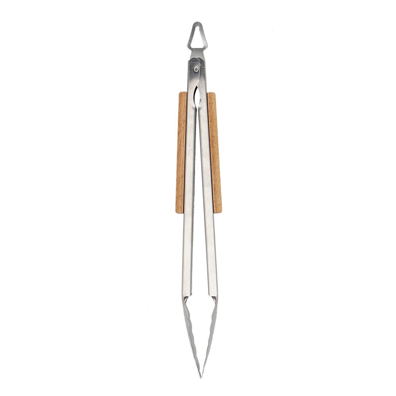 Use these stainless steel and ash wood barbeque tongs to turn hot or cold food over. The tongs have a handy hole at the end to make them easy to hang up. They are easy to use and keep your hands away from oil splashes and the fire. The locking mechanism is user-friendly. - made of 430 stainless steel and ash wood - handy hole for hanging them up