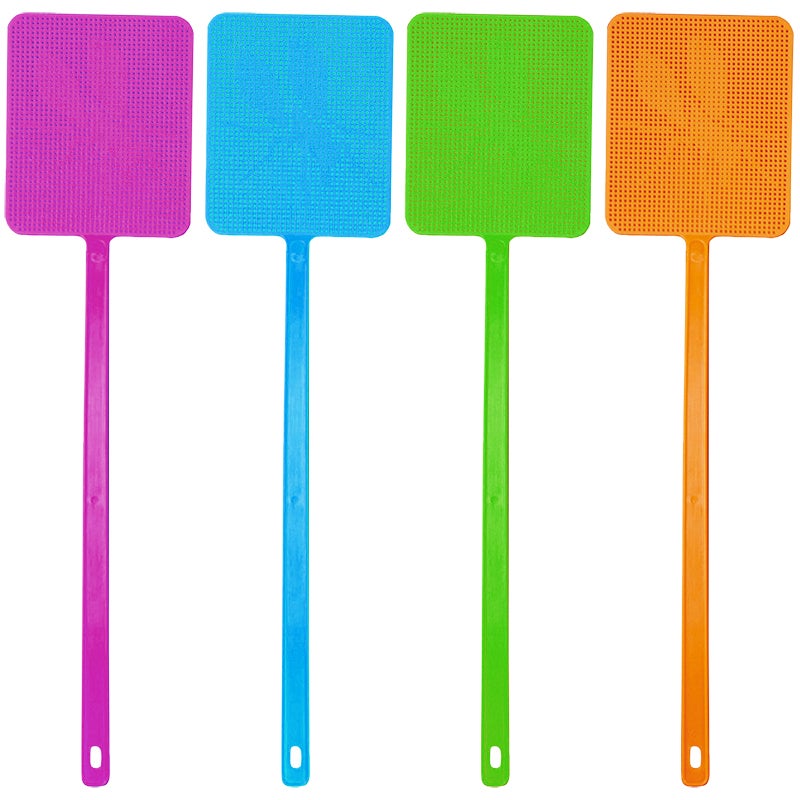 A flyswatter is an essential tool which no household can be without. Thanks to the long handle and flexible swatter, this fly swatter is easy to use. On top of that, the swatter is imprinted with a fly silhouette.- assortment of 4 colours (orange, green, blue and pink)- including display hook shaped like a fly