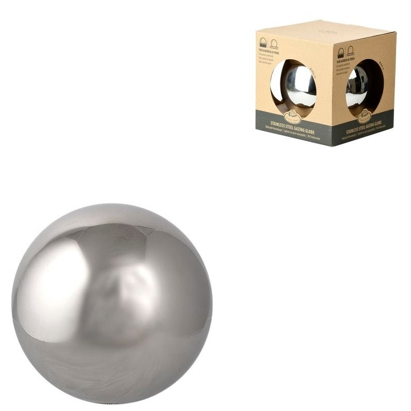 A jewel in every garden with a symbolic meaning. These stainless steel gazing globes were used to ward off witches, diseases and adversity. Witches were not allowed to see their own mirror image; this would deprive them of their magic. Nowadays we use the gazing globe as an eye catcher in the garden, pond or as decoration indoors. The reflection scares the herons and birds of prey away.- Floatable