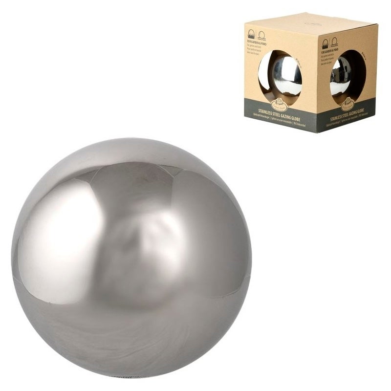 A jewel in every garden with a symbolic meaning. These stainless steel gazing globes were used to ward off witches, diseases and adversity. Witches were not allowed to see their own mirror image; this would deprive them of their magic. Nowadays we use the gazing globe as an eye catcher in the garden, pond or as decoration indoors. The reflection scares the herons and birds of prey away.- Floatable