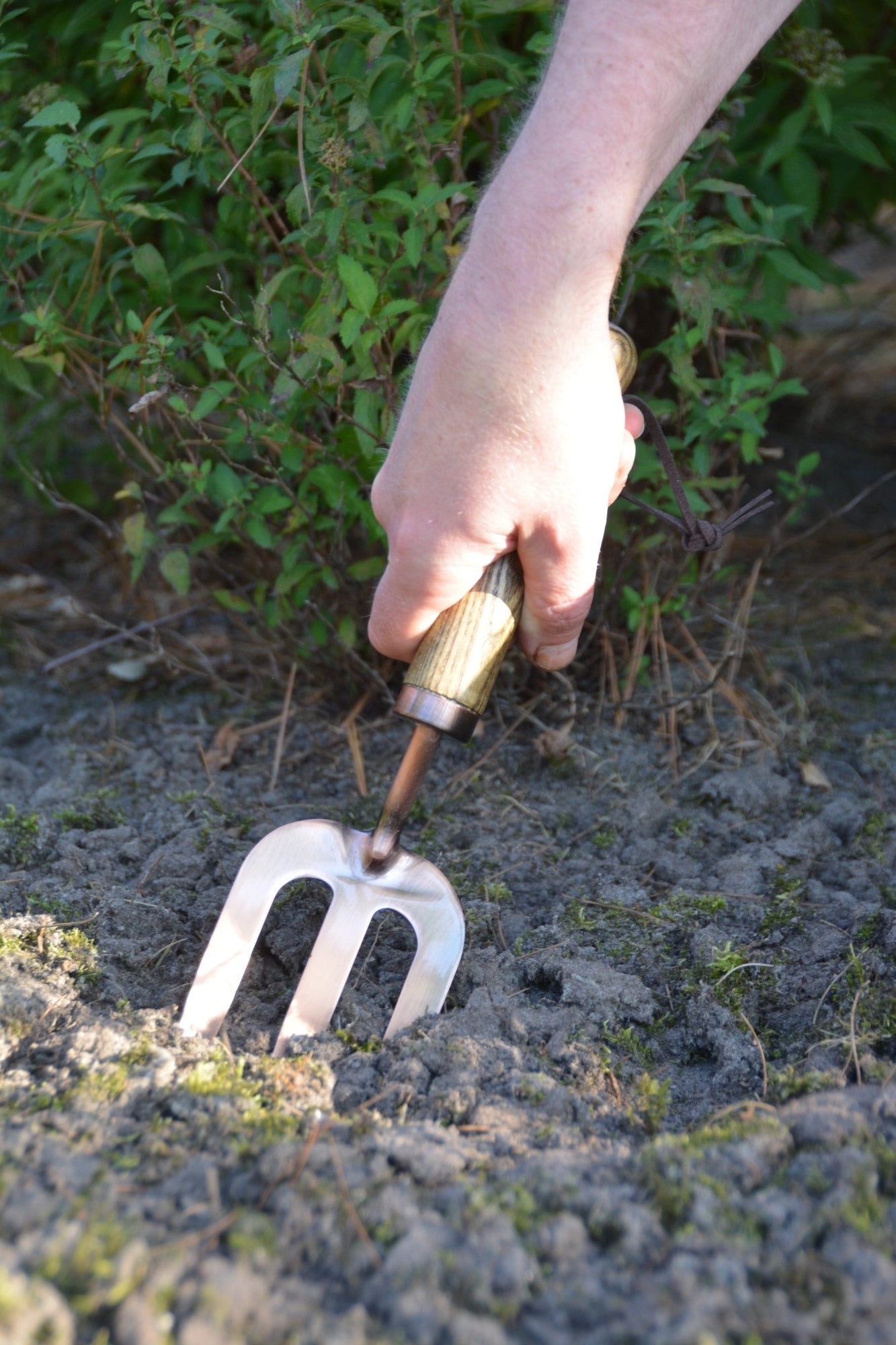 Copper plated rake fork, Ashwood, carbon steel, leather