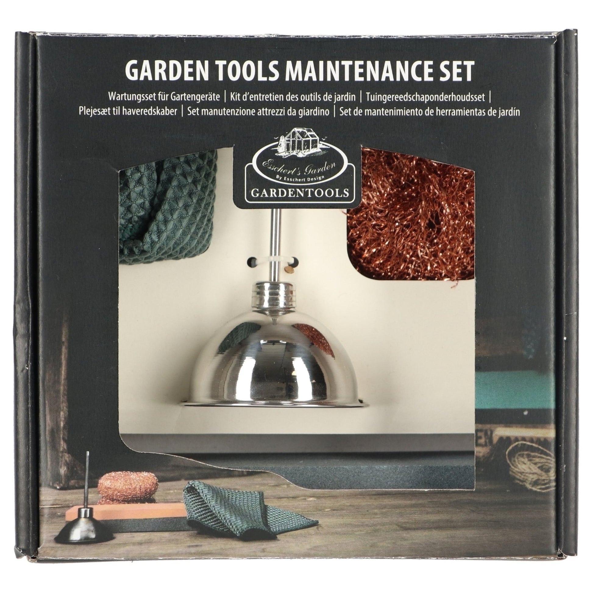Take care of, and make garden tools last longer by using this set consisting of a sharpening stone, copper wool, a stainless steel oil container and a cloth.- makes garden tools last longer- consists of a sharpening stone, copper wool, stainless steel oil container and a cloth- packed in a full colour gift box