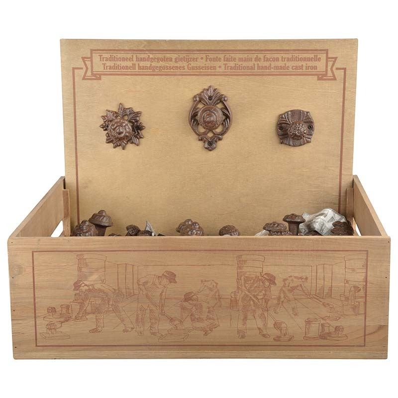 For centuries doors were constructed with door mountings that were both decorative and functional. These robust cast iron door knobs have been hand cast according to age-old tradition and craftsmanship. The Door knobs are delivered in a wooden display box. The lid of the display box can serve as a header card to showcase the door knobs- assortment of 3 designs- two mounting holes per door handle- packaged in wooden display with header card